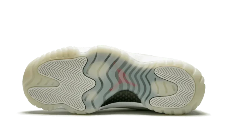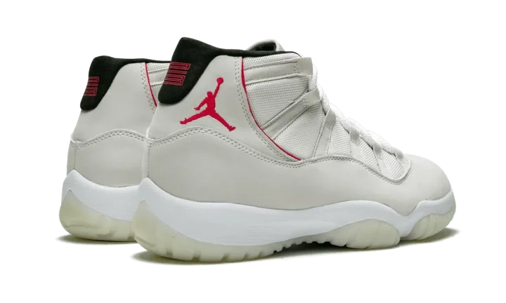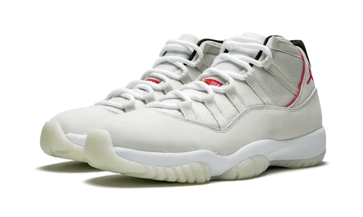 The Air Jordan 11 "Platinum Tint" is a premium edition of the iconic model that debuted in 2018. The "Platinum Tint" colorway eschews the Air Jordan 11's traditional glossy patent leather on the mudguard and features a matte finish across the upper for a striking and refined aesthetic. The light shade of Platinum Tint covers both the ballistic nylon mesh and nubuck panels of the upper. The semi-translucent rubber outsole is also done in a matching shade. Black and red accents provide a nod to Michael Jordan's Chicago Bulls teams. In a first for the Air Jordan 11, an extra layer of piping is added to the ankle panel.