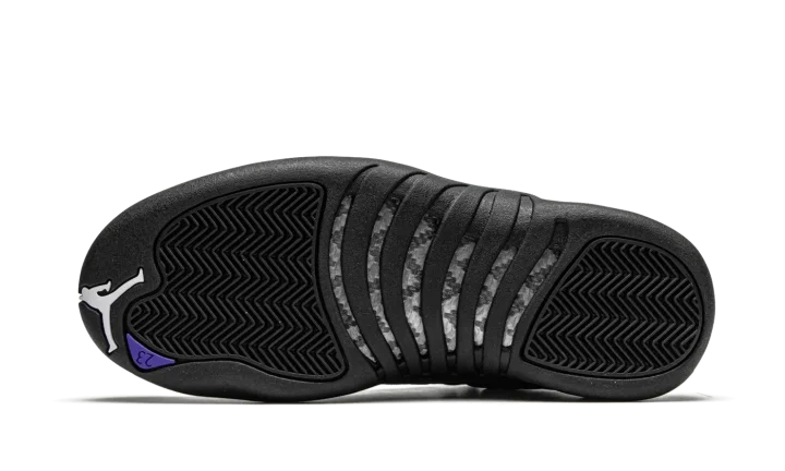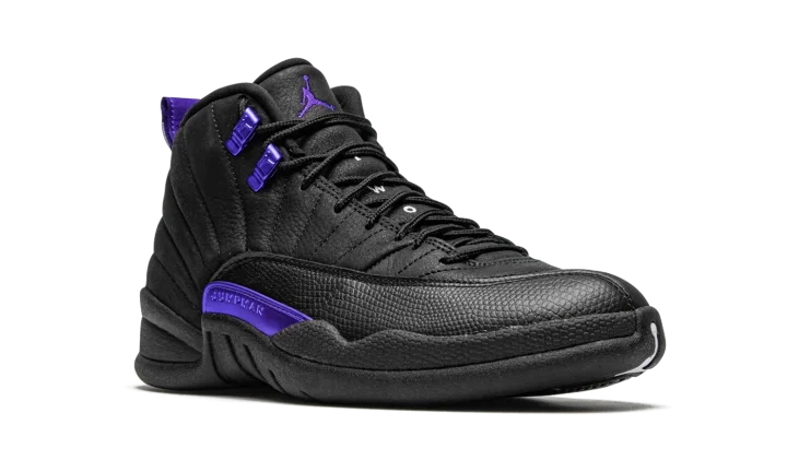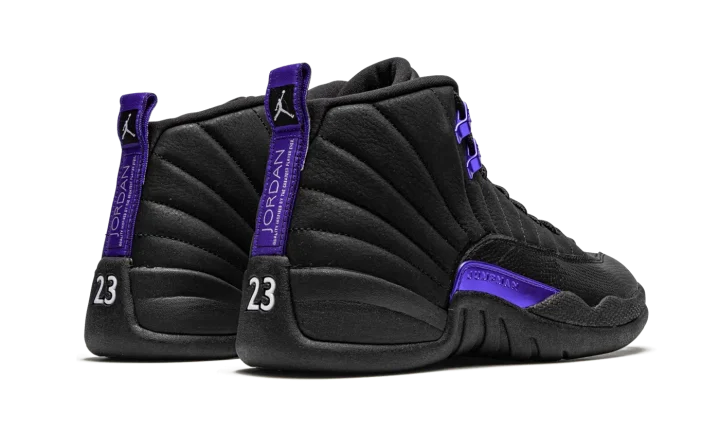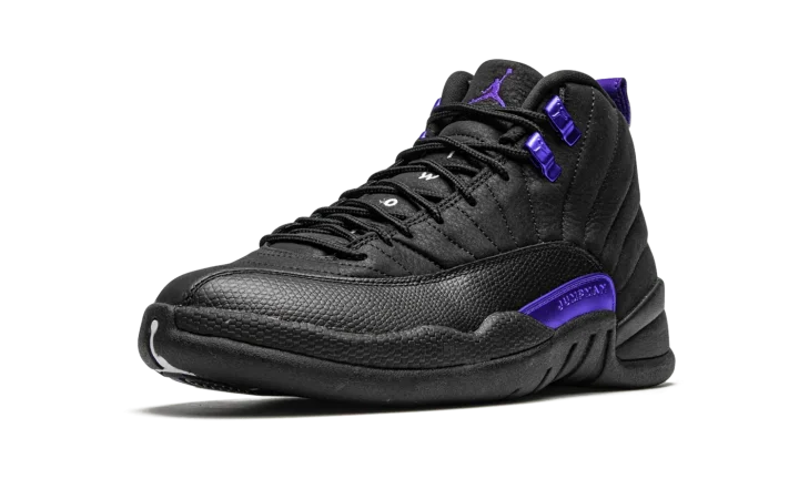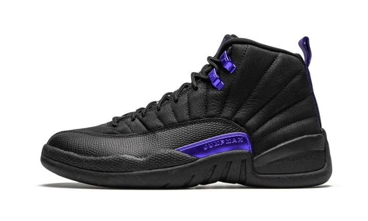 The Air Jordan 12 "Dark Concord" is a colorway from Jordan Brand's Holiday 2020 release cycle that calls to mind classic player exclusive colorways from the 2000s. Although not officially associated with any player or team, the "Dark Concord" Jordan 12 looks as if it could have been worn by Mike Bibby with the Sacramento Kings or even Kobe Bryant back in the day. The upper features a black nubuck construction with faux lizard leather print on the forefoot and mudguard. Dark Concord accented eyelets and Jumpman branding above the black rubber midsole breaks up the shadowy appearance of the shoe. Additional purple detailing can be found on the Jumpman embroidery on the tongue, and on the nylon patch located on the heel. White embroidered "Two 3" branding appears on the tongue, and white "23" detailing dots the back of the shoe. Release date: October 23, 2020.