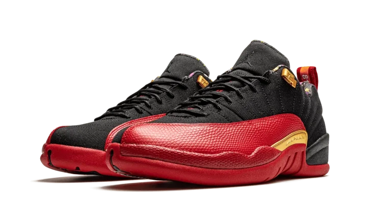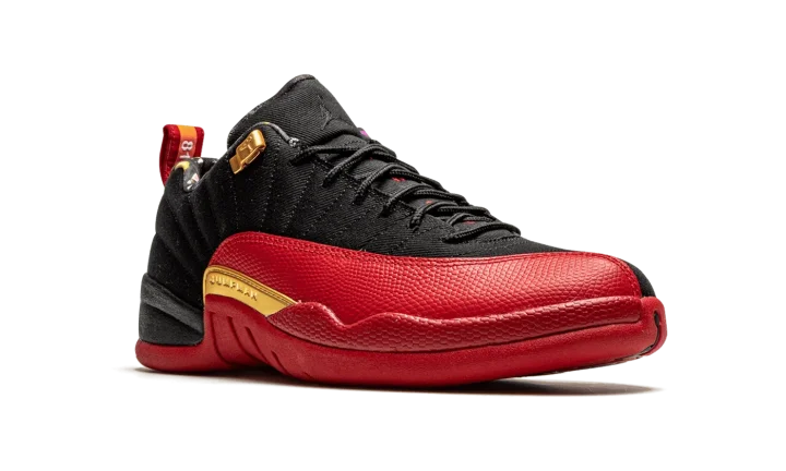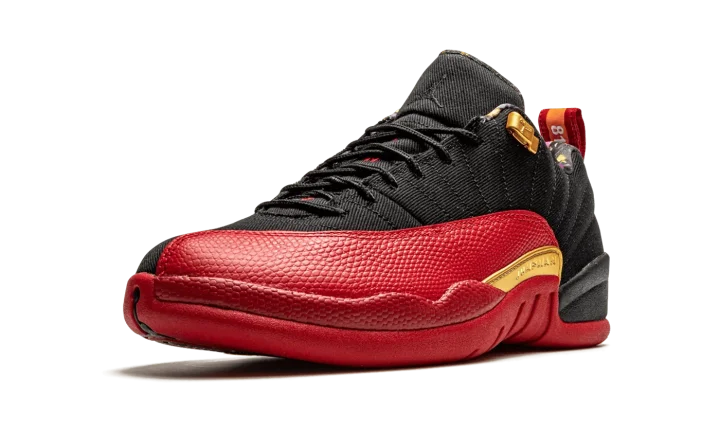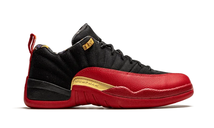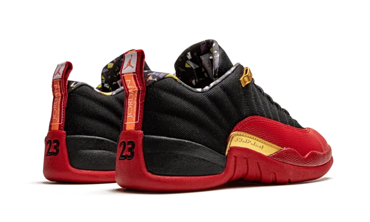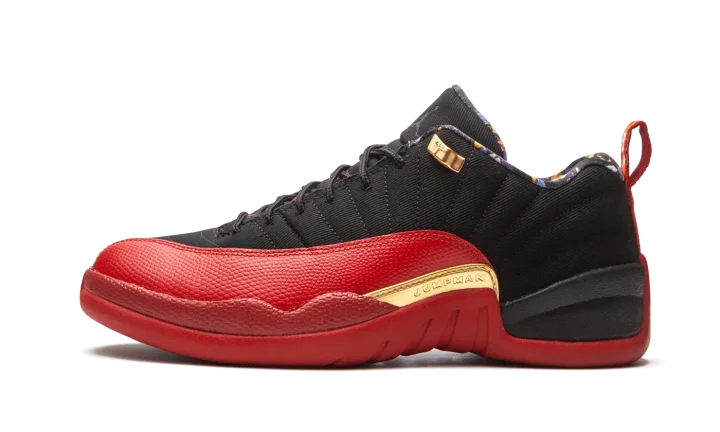 The Air Jordan 12 Low "Super Bowl LV" is a special edition colorway of Michael Jordan's twelfth signature shoe in a colorway dedicated to the biggest sporting event of the year. Released by Jordan Brand in February 2021 ahead of Super Bowl LV (55), which was held in Tampa, Florida, this low-top Jordan 12 displays several football references in its design, beginning with the Vince Lombardi Trophy inspired gold accenting on the mid-panel and confetti-style pattern on the liner. The rest of the look draws favorably from the iconic "Flu Game" colorway worn by Michael during the '97 NBA Finals. A Varsity Red textured leather overlay appears on the forefoot and a black canvas material forms the base of the shoe. Tonal Jumpman embroidery can be found above the red "Two 3" detailing on the middle of the tongue. The colors used on the "ribbon" style design on the heel reference the old team uniform colors of the Tampa Bay Buccaneers. Gold eyelets and a red and black midsole finish off the look. Release date: February 6, 2021.