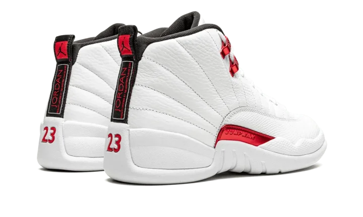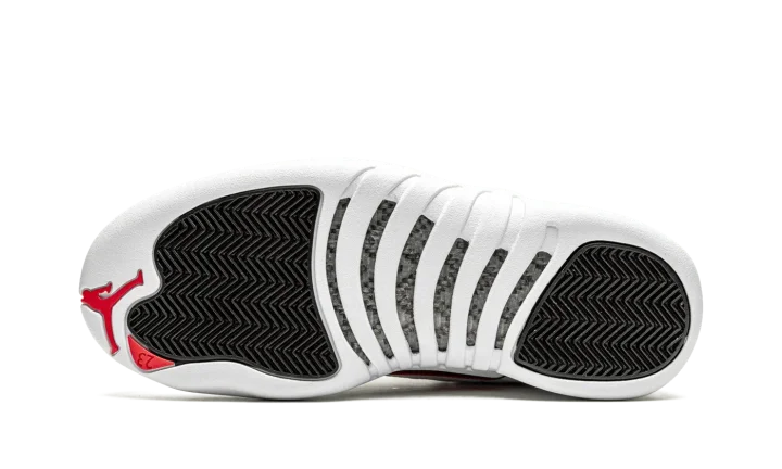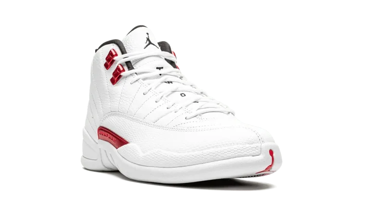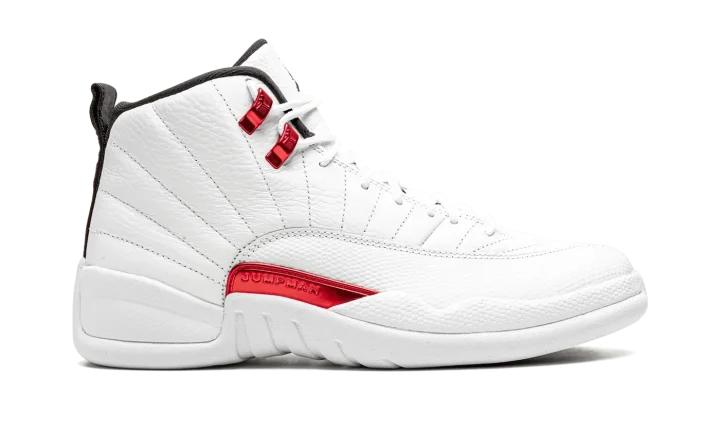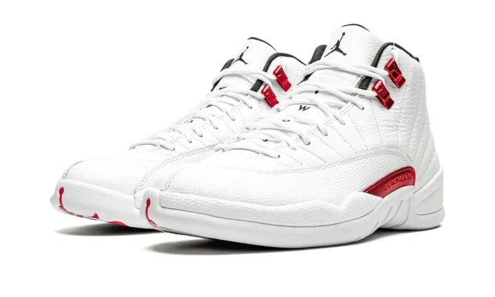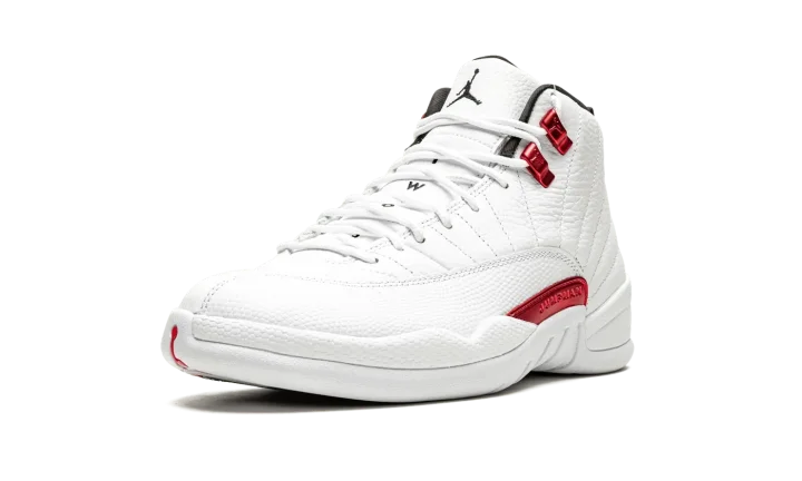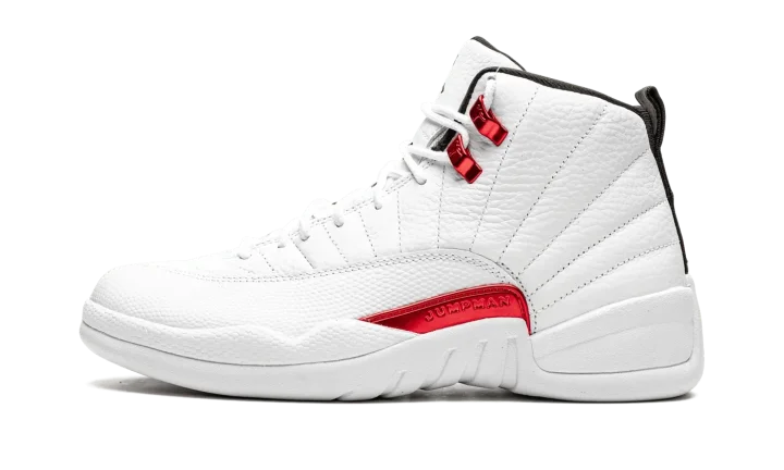 The Air Jordan 12 "Twist" is a crisp, clean, and versatile look for Michael Jordan's twelfth signature shoe that was released by Jordan Brand in Summer 2021. With its Chicago Bulls-inspired white, red, and black color scheme, the "Twist" could have been an original colorway of the Jordan 12 had Nike chosen to release the design back in 1997, not June 2021. Jordan Brand pairs the all-white leather upper with contrasting University Red accents, specifically the metal eyelets and "Jumpman" branding plate on the lateral side of the shoe. Referencing the original design of the Air Jordan 12, the white leather tongue displays black embroidered Jumpman and "Two 3" branding. Red "23" and "Jordan" branding can be found on the back of the white rubber midsole and heel, respectively. Release date: July 24, 2021.