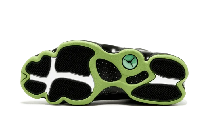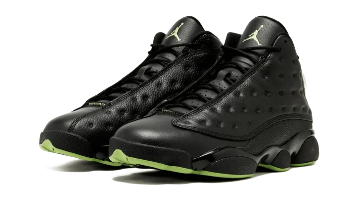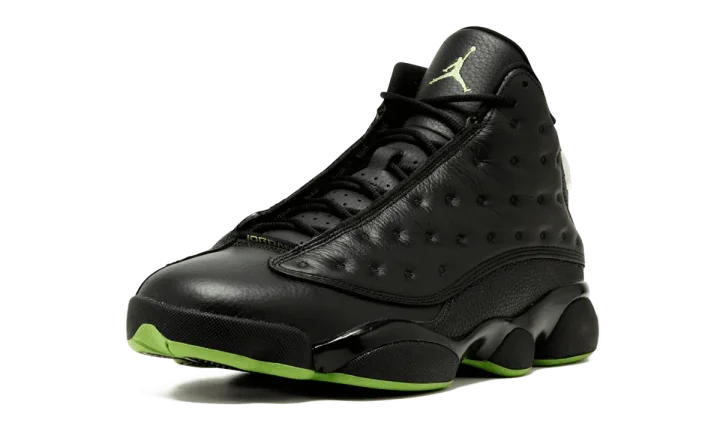 Back again, and this time, just like the original. When the "Altitude" Air Jordan 13 first dropped in 2005, it was one of the first non-OG Air Jordan retro colorways to really cause a stir and become a must-have release for collectors. The black leather colorway with stingray texture detailing and bright green accents just couldn't be denied. While Air Jordan fans welcomed the Altitude Air Jordan 13 back in 2010, some weren't quite satisfied with the change of materials: reflective mesh replacing the full-grain leather paneling across the upper. In 2017 the Altitude 13s make their second return, this time reproduced in the original all-leather upper. Fly in and grab your pair today.