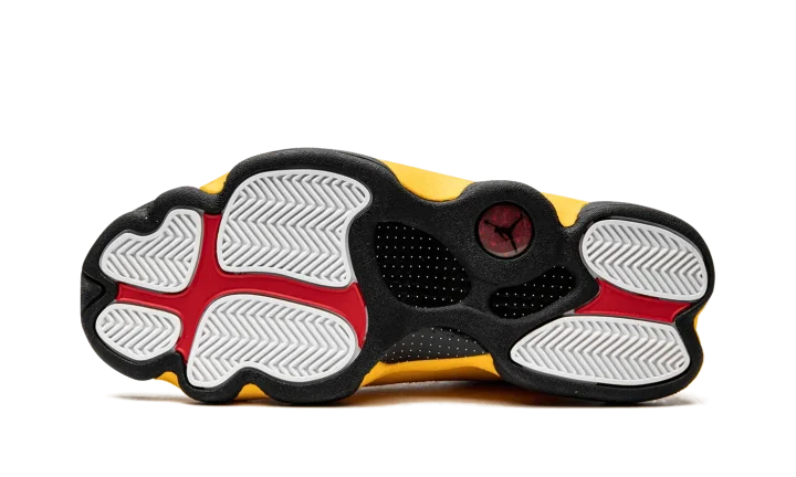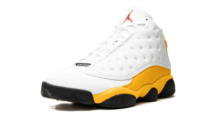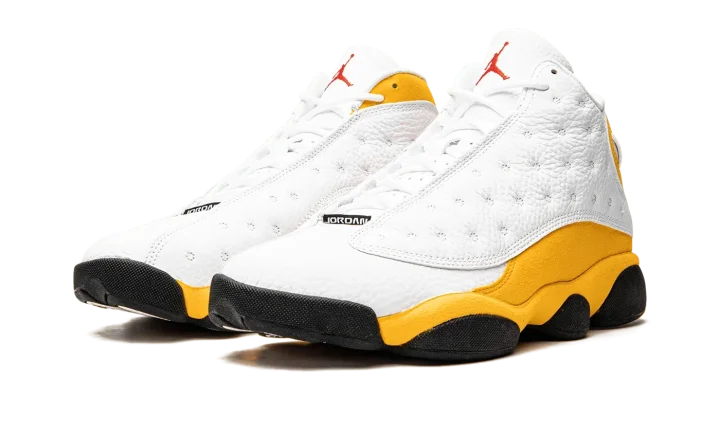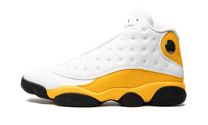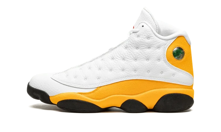 The Air Jordan 13 "Del Sol" is a March 2022 release of Michael Jordan's retro basketball shoe in a colorway that unofficially references the Los Angeles Lakers. The Jordan 13's "Del Sol" makeup is one of several colorways of the classic '90s basketball shoe to show appreciation, unofficially, for the Lakers' team uniform colors. In this instance, the "Del Sol" features the team's white-and-yellow color scheme, and is devoid of any of the purple accenting found on the Lakers' team uniforms. Specifically, Del Sol-colored nubuck appears on the mudguard, heel, and collar. The rest of the upper is outfitted with white leather with dotted embroidery. Branding hits include a black Jordan tag with white lettering on the throat, an embroidered red Jumpman on the white leather tongue, and a holographic emblem on the collar. A black liner and black midsole walls complete the look. Release date: March 22, 2022