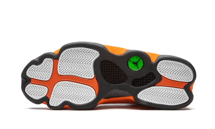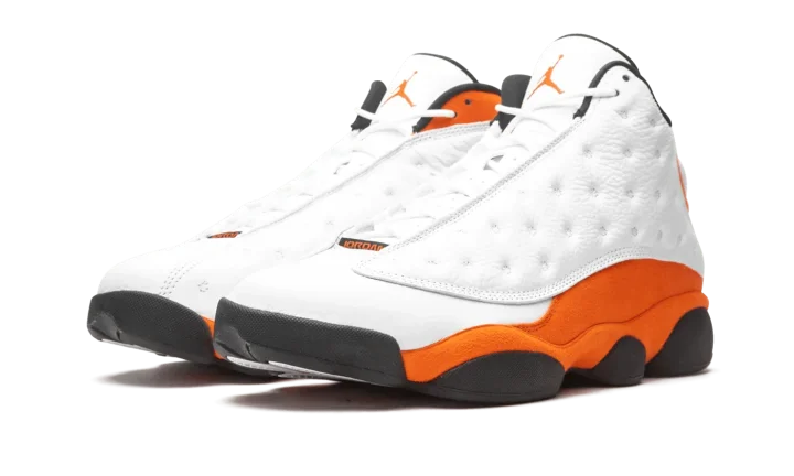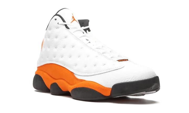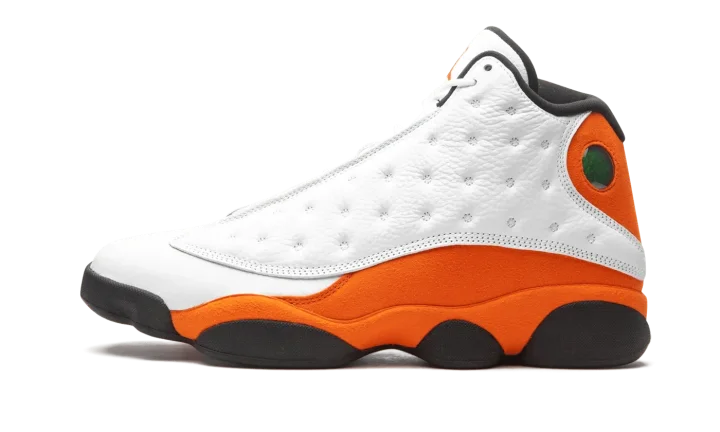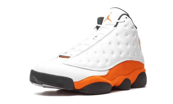 The Air Jordan 13 "Starfish" is a January 2021 colorway of Michael Jordan's thirteenth signature shoe that references the popular "Shattered Backboard" motif. Officially known as "Starfish," this fiery hue of orange has appeared on various Air Jordan 1s since Jordan Brand's introduction of the "Shattered Backboard" theme in 2015. The "Shattered Backboard" story salutes the orange, black, and white team uniform colors of Stefanel Trieste, the Italian League basketball team Michael Jordan suited up for during an overseas exhibition game in 1985. As for this design, crisp white dotted leather appears on the upper and smooth white leather marks the toe. A holographic emblem can be found on the collar and an embroidered orange Jumpman is stitched onto the white leather tongue. A Starfish suede mudguard and heel add a burst of color to the design. Black midsole walls and a black liner finish off the look. Release date: January 16, 2020.