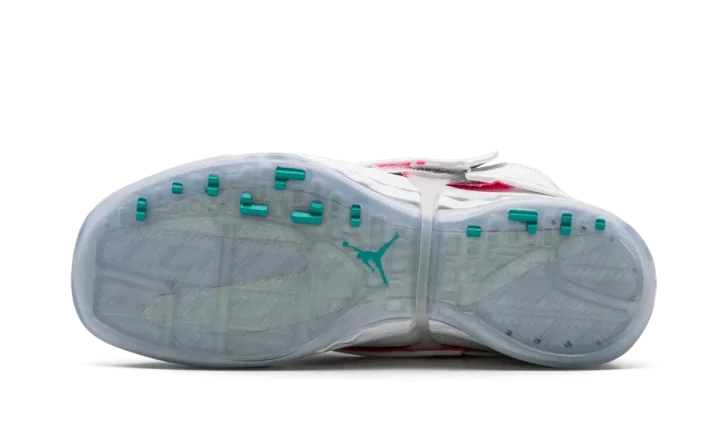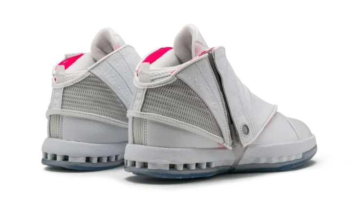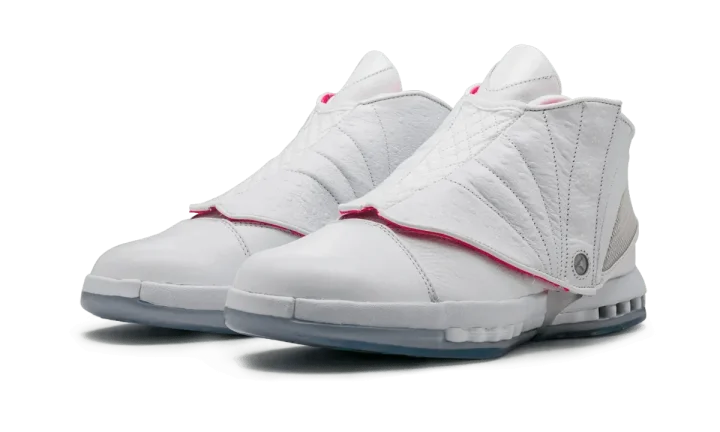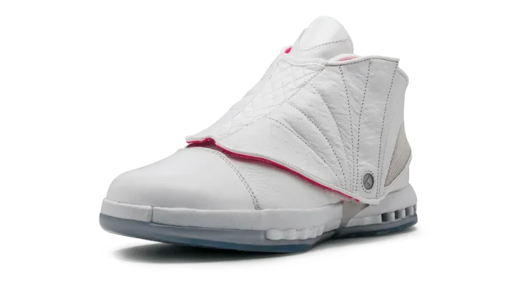 Boasting a "South Beach" theme, the Solefly x Air Jordan 16 Retro released in 2016. If features an completely white leather upper with ostrich leather on the removable shroud (which is reversible and can be worn on the Pink Flash side as well). Neon pink and turquoise accents complete the shoe.