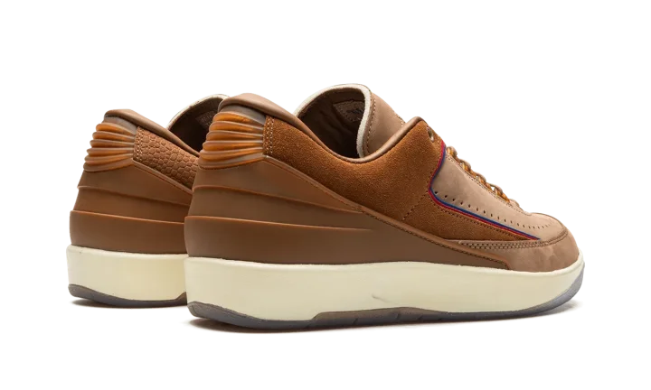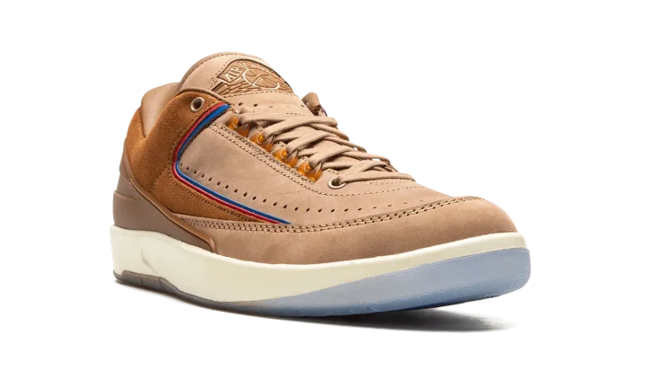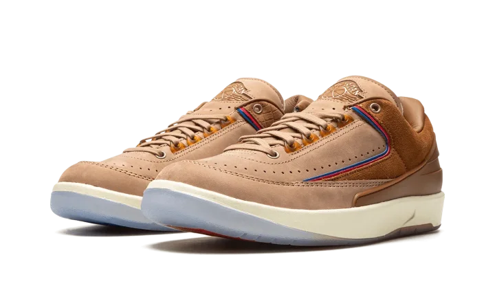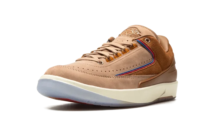 The Two 18 x Air Jordan 2 Low is a collaboration by the Detroit-based sneaker boutique on the low-top version of the retro basketball shoe. One of several Air Jordan 2 collaborations from 2022, Two 18 brings a lifestyle-focused, earth tone design to Michael Jordan's second signature shoe. The upper is designed in tan nubuck with rust brown suede overlays on the lateral side and faux reptilian overlays on the medial side. Blue and red piping, a nod to the Detroit Pistons' team uniform colors, is found along the both panels. A classic "Wings" logo can be found on the tongue and Two 18 branding appears on the insole. The shoe is complete with a cream foam midsole and translucent rubber outsole. Release date: October 21, 2022