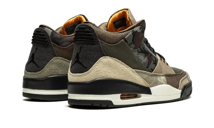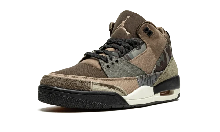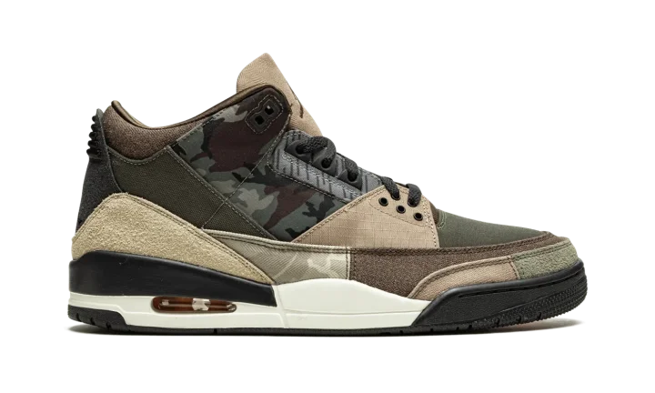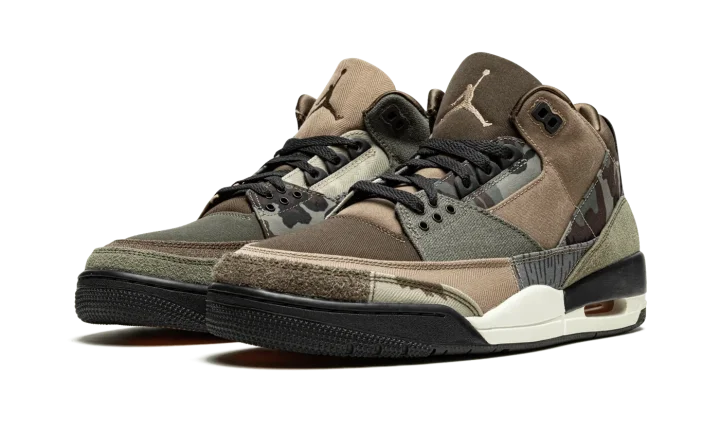 The Air Jordan 3 "Patchwork Camo" is a November 2021 release of Michael Jordan's third signature shoe in a colorway that features three different types of camouflage print. The classic basketball shoe displays "rain," "leaf," and "woodland" camo patterns on multiple overlays on its design, a first for the Jordan 3. The left and right shoes feature various earth-tone colors and camo panels in a mismatched design. A velcro-style "Nike Air" patch can be added or removed from the heel. The unique Jordan 3 is completed with a white midsole and a black outsole with orange accents. Release date: November 29, 2021