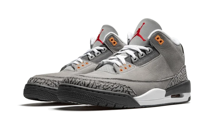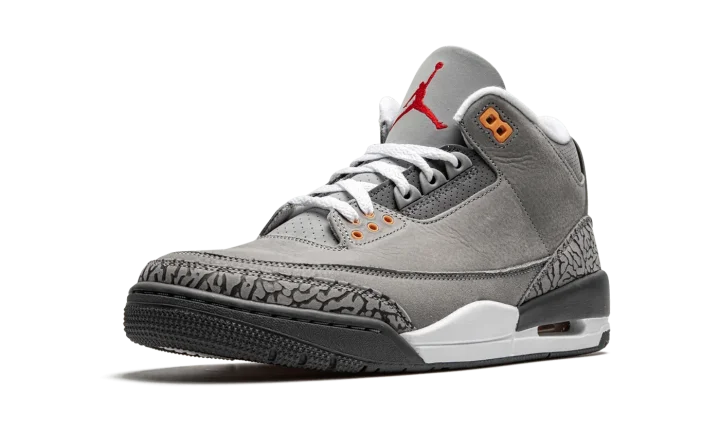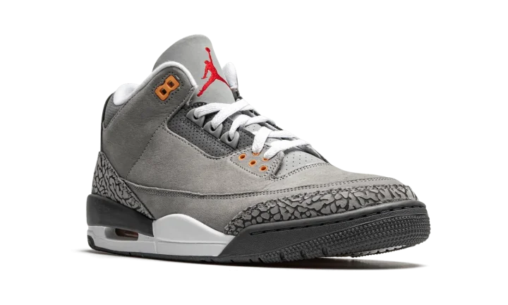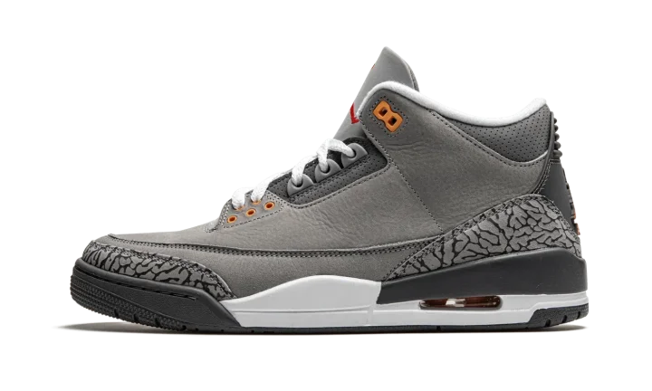 The Air Jordan 3 "Cool Grey" is a lifestyle colorway of Michael Jordan's third signature shoe that first released all the way back in 2007. The "Cool Grey" seen here was remastered by Jordan Brand as part of its Spring 2021 release cycle. It features several upgrades in design in comparison to the original version of the shoe, including a new premium grey leather construction on the upper and a slightly darker grey midsole. Elsewhere, dark grey leather appears around the eyelets and collar and classic elephant print detailing can be found on the toe and heel. A red Jumpman logo is embroidered on the grey leather tongue. Orange eyelet holes appear on the collar and base of the tongue. A Sport Red Jumpman dots the back of the shoe to finish off the look. Release date: February 20, 2021.