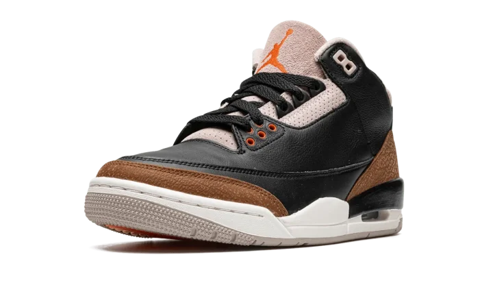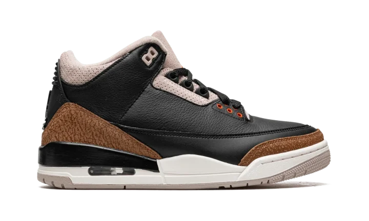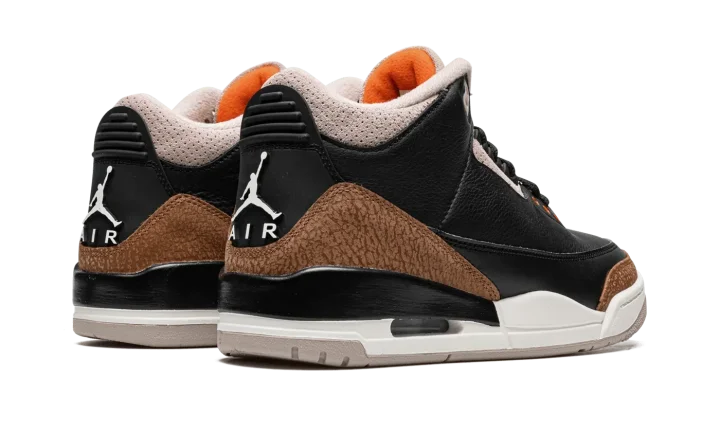 The Air Jordan 3 "Desert Elephant" remixes an original colorway of the heralded basketball sneaker. An April 2022 release by Jordan Brand, the "Desert Elephant" nods to the Jordan 3's original, iconic "Black Cement" colorway, as it features the same color block as the original version with a few modifications. The "Desert Elephant" is complete with a black tumbled leather upper, red lower eyelets, elephant print, and black laces, just like the "Black Cement." However, the "Desert Cement" replaces all grey elements with sandy beige accenting that gives the shoe a decidedly retro flair. Specifically, the eyelets, leather tongue, collar, inner lining, and the elephant print all appear in Desert Cement. Finishing touches include a white midsole with a visible Air bubble in the heel and a Desert Cement-colored rubber outsole. Release date: April 30, 2022