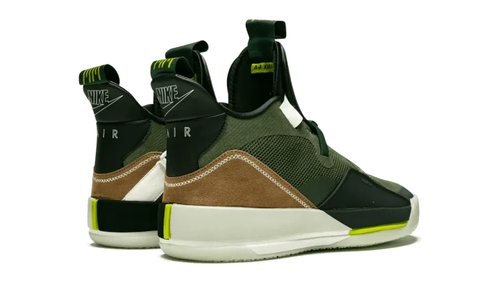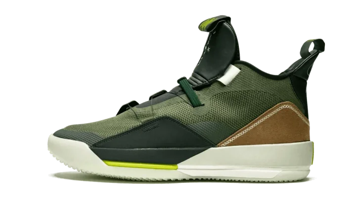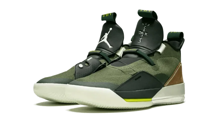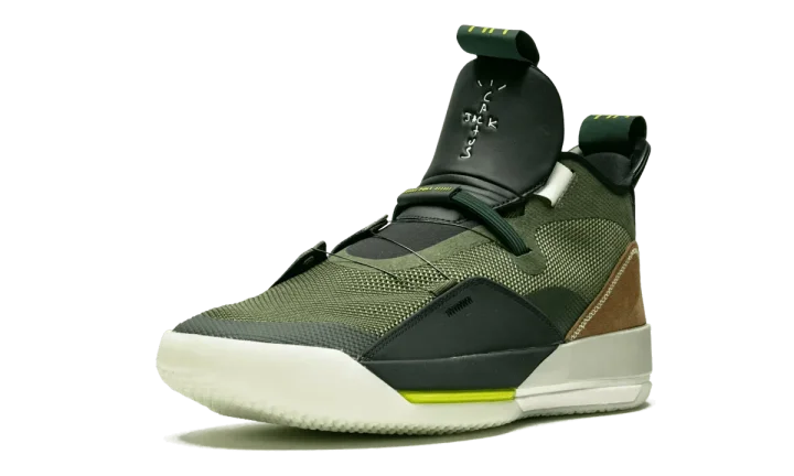 The Travis Scott x Air Jordan 33 "Cactus Jack" is the rap superstar's special colorway of the high-performance Jordan Brand basketball shoe. The thirty-third flagship Air Jordan model receives a stylish makeover from Scott, featuring an olive green mesh upper with darker green accents and brown suede detailing around the heel. Bright lime green accents supply a pop of color throughout the shoe, while Scott's "Cactus Jack" logo is found on the left tongue. The Air Jordan 33 features an innovative FastFit system that does away with laces and secures the foot with the simple pull of a midfoot strap. The Travis Scott x Air Jordan 33 "Cactus Jack" released in 2019.