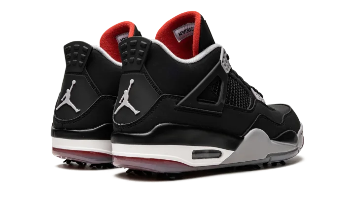 The Air Jordan 4 Golf "Bred" is the alternate version of the retro basketball shoe designed specifically for the golf course. Appearing in the Jordan 4's original "Bred" colorway, a design worn by Michael Jordan with the Chicago Bulls in the late 1980s, the Jordan 4 Golf features removable spikes for superior grip on the fairway. The upper is constructed in black synthetic nubuck with black netting on the mid-panel and tongue. The "wings" are painted black and the eyelet overlays appear in Cement Grey. A white Jumpman with "Air" branding is found on the heel tab and a Fire Red Jumpman and white script "Flight" branding appear on the tongue tag. The Air Jordan 4 Golf "Bred's" upper is consistent with the styling of the shoe's original version. Release date: December 22, 2021