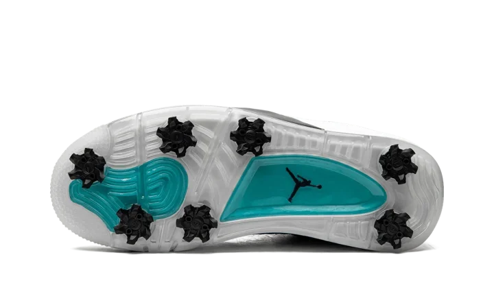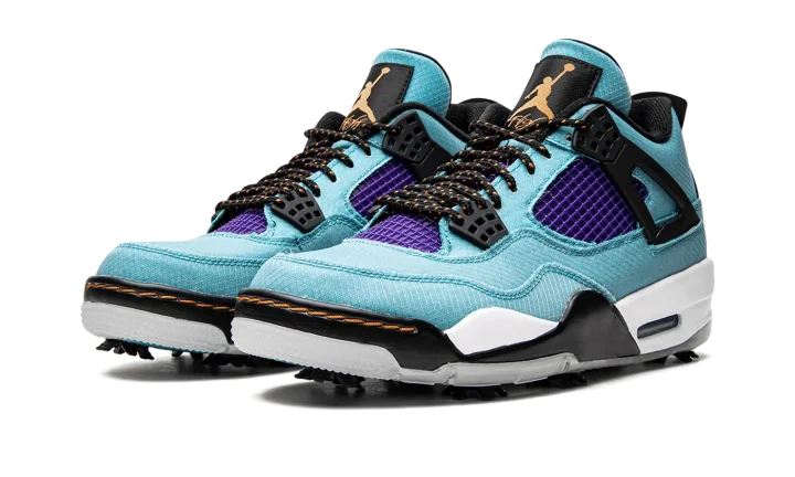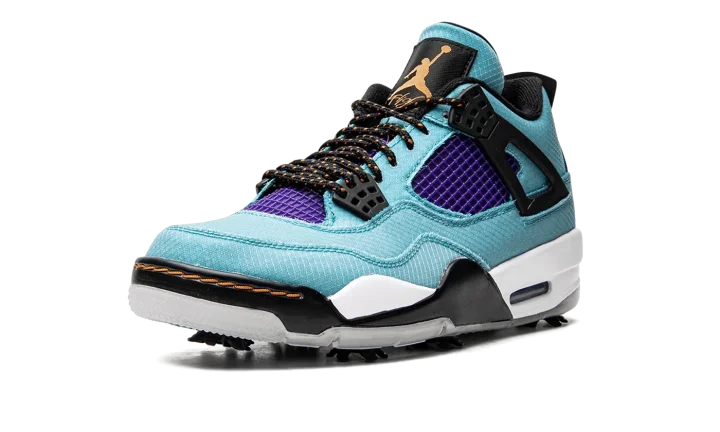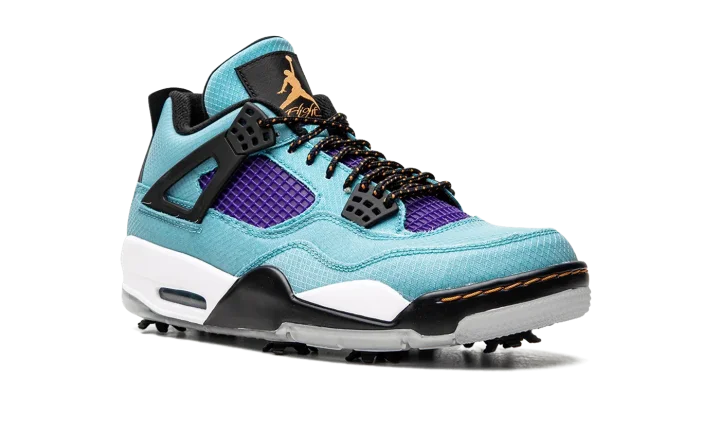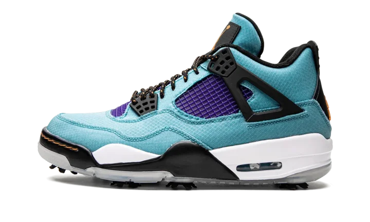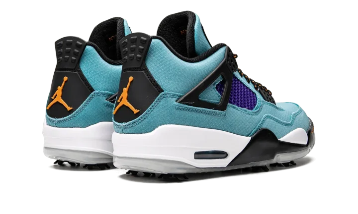 Inspired by Nike's All Conditions Gear line, the Air Jordan 4 Golf "Torrey Pines" brings a vibrant feel to this classic basketball shoe that has been updated for golf. The shoe's upper is built with water-resistant textile in place of the usual leather or nubuck. Accent hues include teal and purple on the signature netting, and black contrasts emerge throughout. The heel and tongue Jumpman logos add orange highlights. Underfoot, visible Air in the heel of the midsole provides cushioning with removable spikes for traction on the golf course.