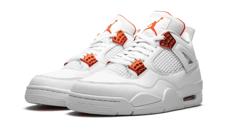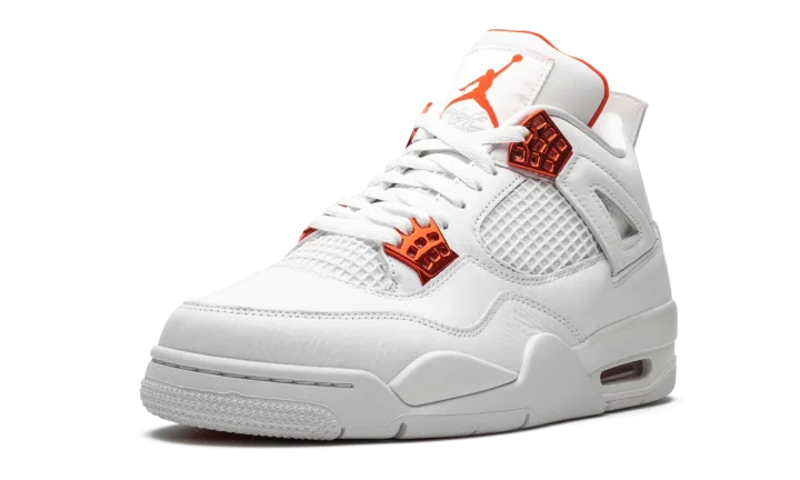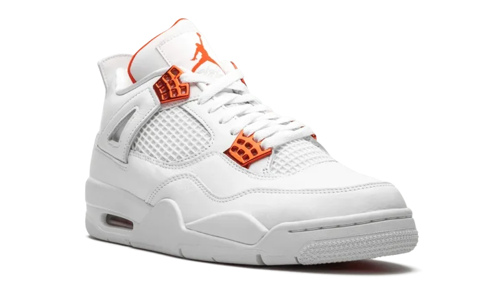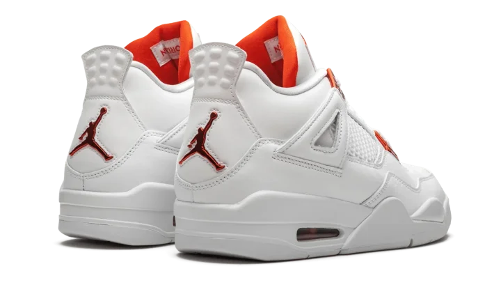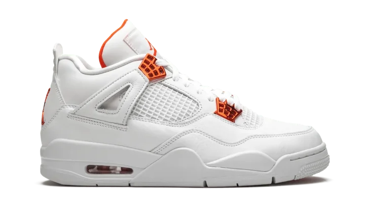 The Air Jordan 4 "Metallic Pack - Orange" is part of Jordan Brand's 2020 collection of "Metallic" colorways inspired by an original design from the 1980s. One of several "Metallic Pack" Jordan 4s, this "Orange" design is reminiscent of the Air Jordan 1 of the same nickname from 1985, which was an original makeup of Michael Jordan's first signature shoe. The two-toned appearance features a white leather upper with tonal netting on the mid-panel and throat. Metallic Orange hits on the lace eyelets and Jumpman detailing on the heel provide a stark contrast to the neutral base. Additional orange Jumpman branding can be found on the nylon tongue tab. The hue also appears on the inner lining of the tongue. The classic Air Jordan 4 appearance of this "Metallic Orange" design includes a small visible Air window in the heel. Release date: May 20, 2020.
