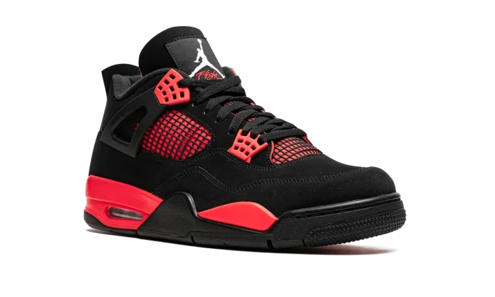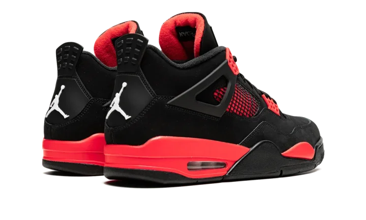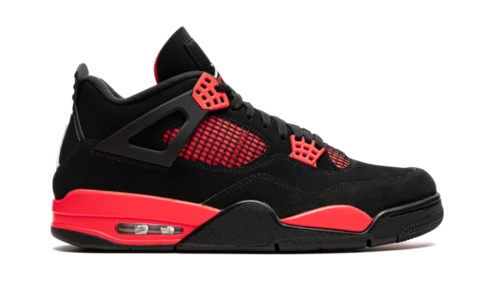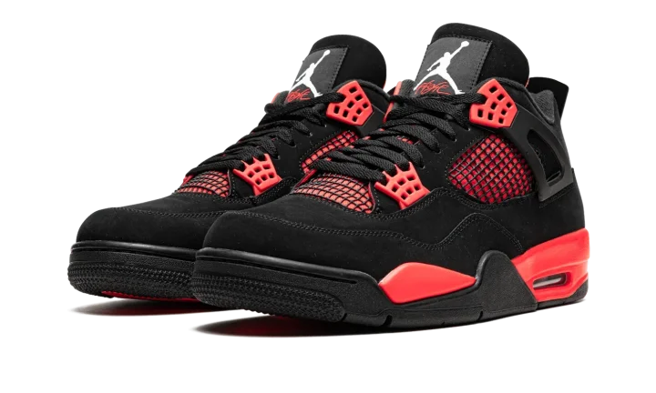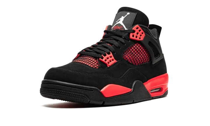 The Air Jordan 4 "Red Thunder" is an October 2021 release of Michael Jordan's fourth signature shoe that draws comparisons to a popular look in the Air Jordan 4's line. The shoe we're referring to is the Jordan 4's "Thunder" colorway from 2006's "Thunder & Lightning" pack that was released in limited quantities exclusively on Jumpman23.com, Jordan Brand's former website. On the "Red Thunder," the look mimics the original Thunder by substituting the latter's yellow accents for red. The upper features a black synthetic nubuck base with red detailing beneath the mesh on the sides and tongue. Red "wings" lace holders contrast the neutral-colored upper. A white Jumpman appears on the heel. The look is brought together by the red painted midsole. A small clear Air unit in the heel puts the finishing touches on the Air Jordan 4 "Red Thunder." Release date: October 2, 2021