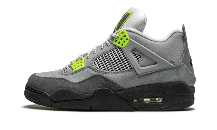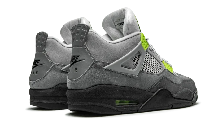 The Air Jordan 4 "Air Max 95 Neon" is a special Air Max month release of Michael Jordan's fourth signature basketball sneaker that honors the equally legendary Air Max 95 "Neon" colorway. The Air Max 95 "Neon" debuted in 1995 as the flagship design of the highly innovative performance running sneaker that instantly became popular thanks to its appealing looks, top flight comfort, and first-ever visible forefoot Air. Now, the ahead-of-its-time design finds its way to the Air Jordan 4 and the results are favorable. Donning the upper is the same gradient grey color scheme of the Air Max 95 that features various shades of the neutral color starting from light at the collar and gradually getting darker as it works down to the midsole. Bright neon accenting along the netted panel, eyelets, and Jumpman branding on the tongue and heel add '90s-era contrasting to the silhouette. Finishing off the look is a black rubber midsole with a visible neon-tinted Air unit in the heel. Release date: March 2020.