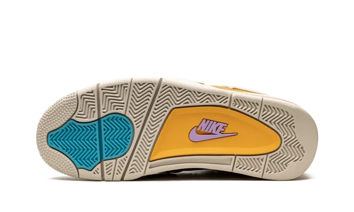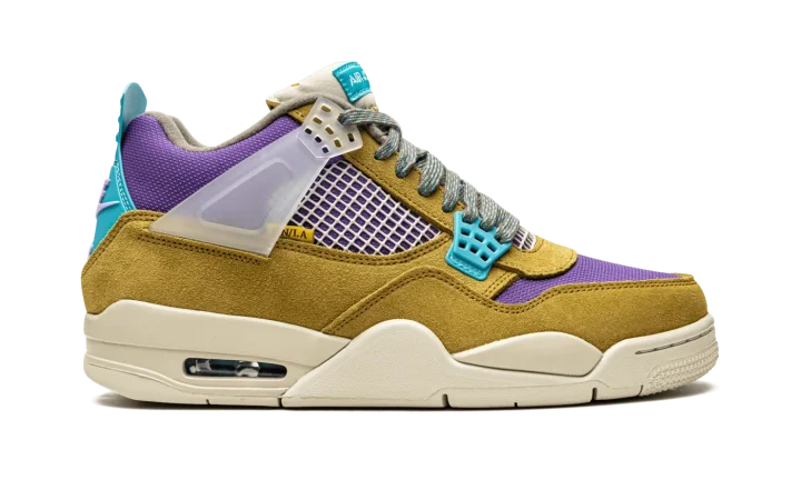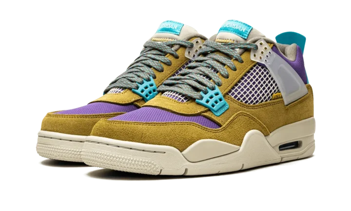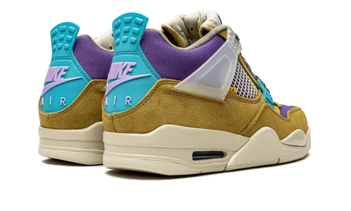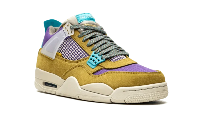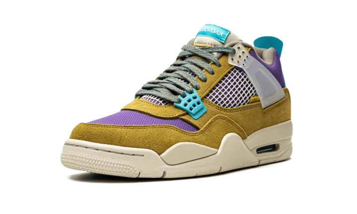 Desert moss/turquiose/blue suede x Union Air Jordan 4 Retro SP sneakers "30th Anniversary - Desert Moss" from JORDAN featuring panelled design, mesh detailing, logo patch at the tongue, raised logo detail, round toe, front lace-up fastening, signature Air cushioning, rubber sole, transluscent wings, stitched-down tongue and Release date: June 20, 2021. These styles are supplied by a premium sneaker marketplace. Stocking only the most sought-after footwear, they source and curate some of the most hard to find sneakers from around the world..