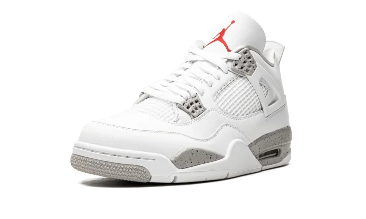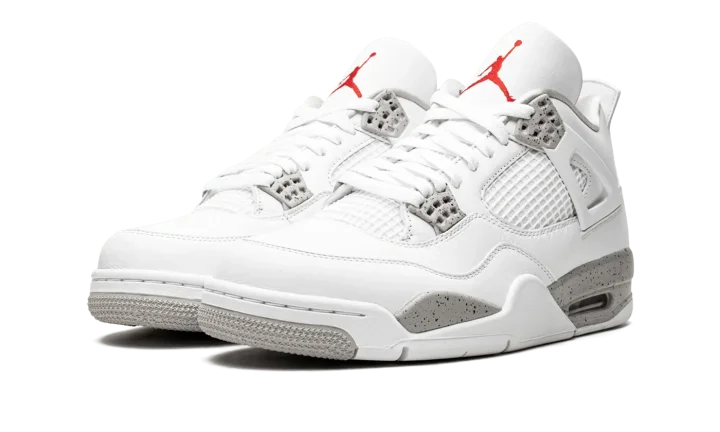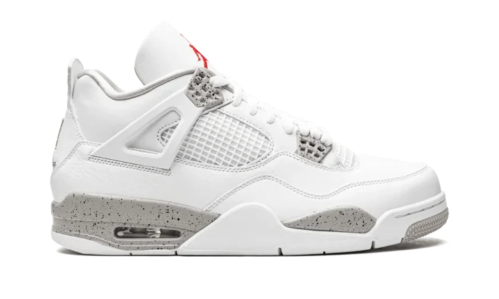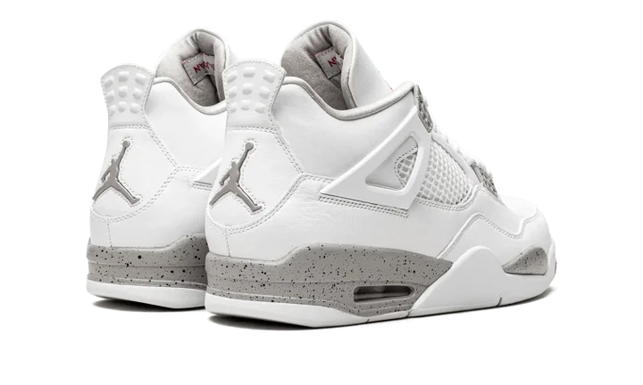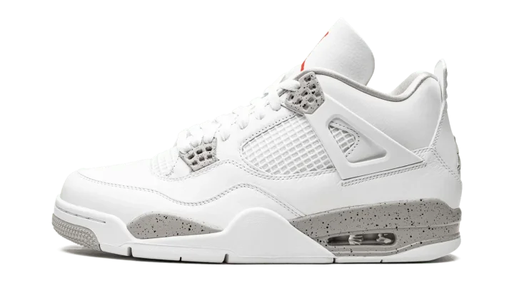 The Air Jordan 4 "White Oreo" is a Summer 2021 release by Jordan Brand that combines two popular colorways of Michael Jordan's fourth signature shoe into one design. The styles we're referring to are the Jordan 4 "Oreo" and "White/Cement," which are fused together to create the predominantly monochromatic white design of the "White Oreo." Like the "White/Cement," the "White Oreo" shares a white tumbled leather construction with cement grey speckling on the eyelets and on the painted midsole. White netting can be found on both the mid-panel and tongue. Jordan Brand paints the model's signature "wings" white and adds a Fire Red embroidered Jumpman to the white leather tongue. A metallic silver Jumpman logo adorns the heel. A small visible Air unit can be found in the heel of the cement grey midsole to finish off the look. Release date: July 3, 2021