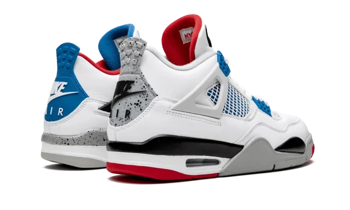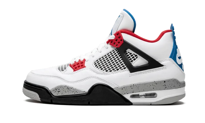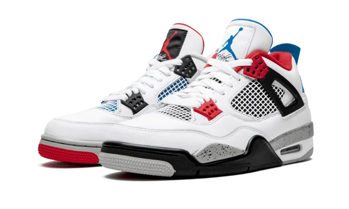 The Air Jordan 4 "What The" combines colorways of some of the most timeless Jordan 4s into one. The "What The" release celebrates the 30th Anniversary of the Air Jordan 4 model. The "White Cement," "Military Blue," "Fire Red," and "Black Cement" colorways all receive love and are featured on parts of both pairs of the design. A white leather base covers the mid-panel, toe, and heel of both sneakers. The left pair features a black base beneath white netting on the mid-panel. Fire Red eyelets appear on the design, with a black triangular wing and embroidered Military Blue Jumpman logo covering the tongue. A blue heel tab with white Nike Air branding on top puts the finishing touches on the left shoe. The right shoe features a blue base beneath the white netting, blue eyelets, and a black-based red Jumpman logo on the tongue. Grey triangular wings and a black mudguard and white rubber sole with a Fire Red outsole complete the look of the right shoe. Release date: November 23rd, 2019.