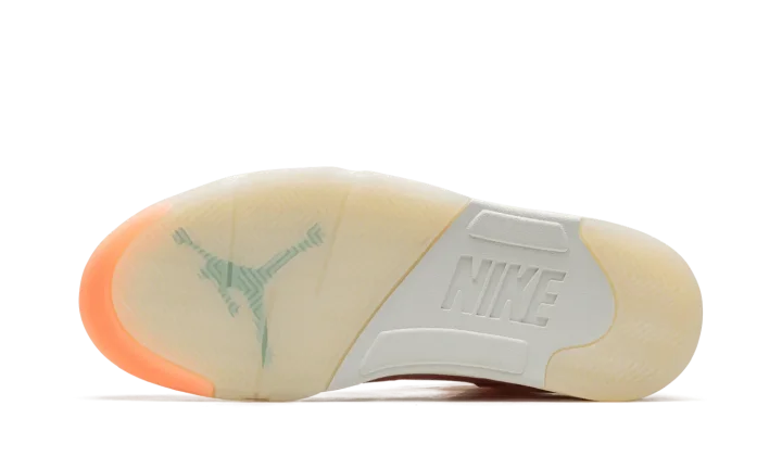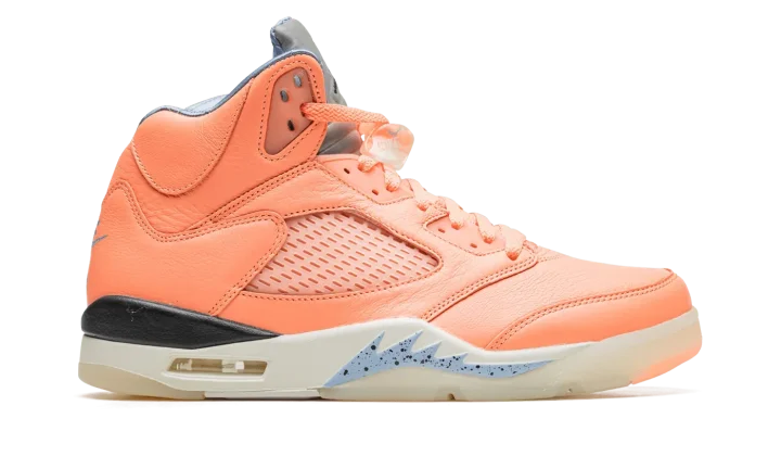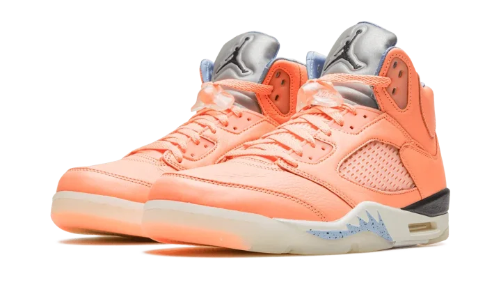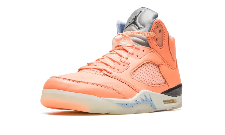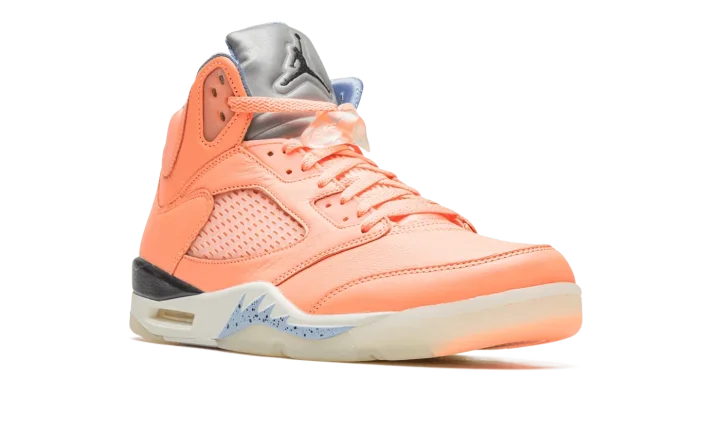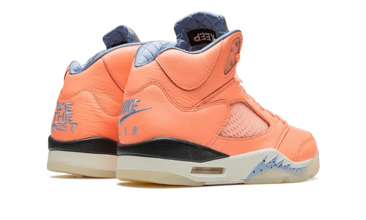 The DJ Khaled x Air Jordan 5 "Crimson Bliss" is a special collaboration by the famous hip-hop producer on Michael Jordan's fifth signature shoe. From DJ Khaled's collection of pastel-colored Jordan 5s, the "Crimson Bliss" is inspired by Miami and warm weather, as the shoe's pink appearance undoubtedly calls to mind both the Florida city and its climate. The shoe features a Crimson Bliss-colored leather construction with translucent netting on the tongue and mid-panel. Blue "West the Best" branding inspired by Khaled's signature catchphrase is embroidered on the heel of the left shoe while the Jordan 5's original "Nike Air" detailing is embroidered on the heel of the right shoe. The words "Keep" and "Going" are found on the underside of the blue quilted tongue tag. Classic Jumpman logo detailing appears on the Metallic Silver reflective tongue. Khaled's "Crimson Bliss" Jordan 5 retains the shoe's original shark tooth detailing on the midsole. Release date: November 28, 2022