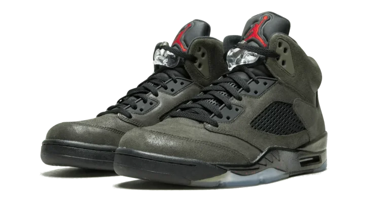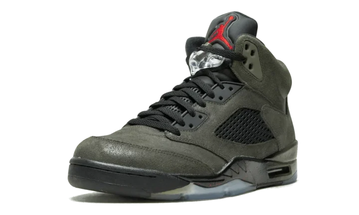 From the Air Jordan retro Fear Pack of 2013 with similar colorways of the Air Jordan 3 and 4, this Air Jordan 5 features a Sequoia green suede upper with black, olive, and red accents. the Fear Pack is inspired by a quote from Michael Jordan: "I'm scared of what I won't become, and you're scared of what I could become."