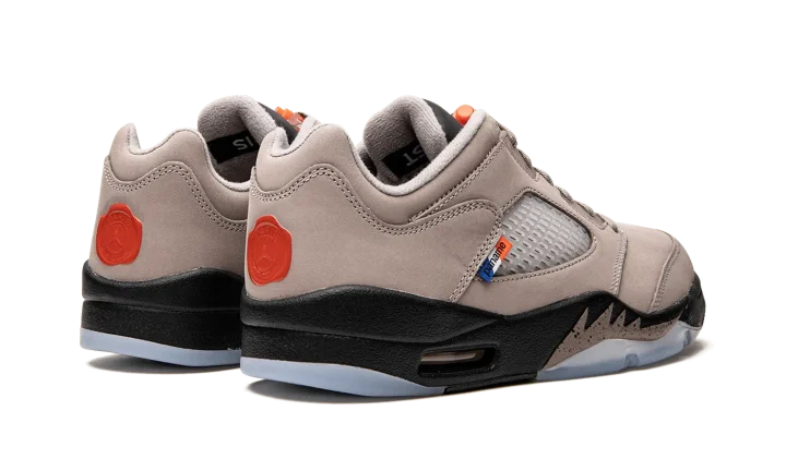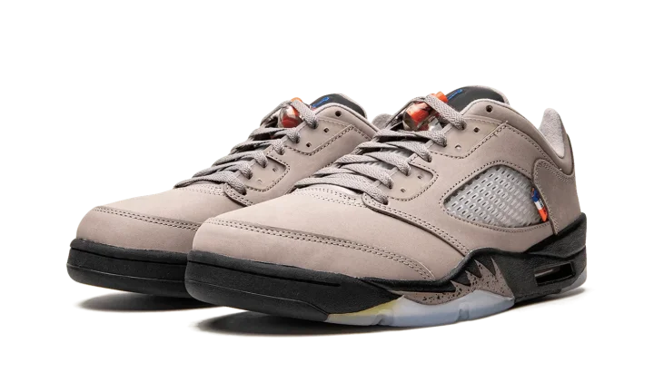 The PSG x Air Jordan 5 Low is a collaboration between the Parisian soccer team and Jordan Brand on a neutral colorway of Michael Jordan's fifth signature shoe. Prior to releasing this shoe in September 2022, Paris Saint Germain and Jordan Brand collaborated on a colorway of the Air Jordan 5 in 2018 that was released to the public as well as a colorway made exclusively to friends and family of both brands. The upper features a grey nubuck construction with translucent netting on the mid-panel and tongue. The lateral side of the shoe features a "Paname" tab. A red waxed "PSG" seal can be found on the heel. The black painted midsole is contrasted with grey speckled shark tooth detailing. Release date: September 3, 2022