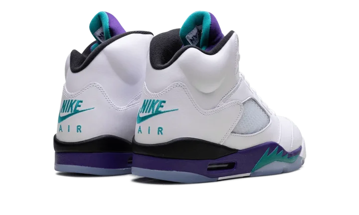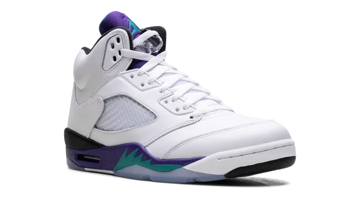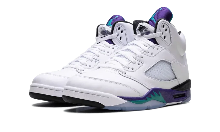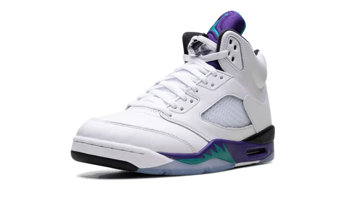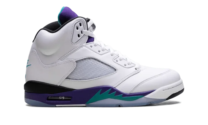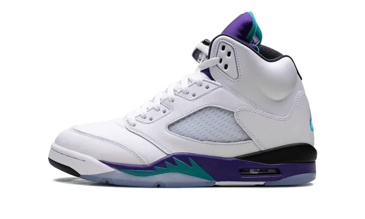 The Air Jordan 5 "Grape" is one of the most popular colorways of Michael Jordan's fifth signature shoe. Popularized by its appearance on the TV show The Fresh Prince of Bel-Air, the "Grape" AJ5 OG returned in 2025. The sneaker features a white upper that is accented with a purple tongue adorned with an aqua Jumpman logo. The Jordan 5 also has purple and aqua accents on the midsole and the Air Jordan 5's signature toggle lace lock.