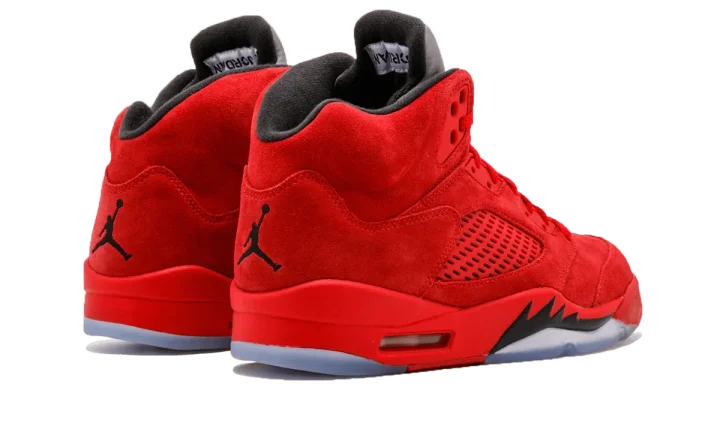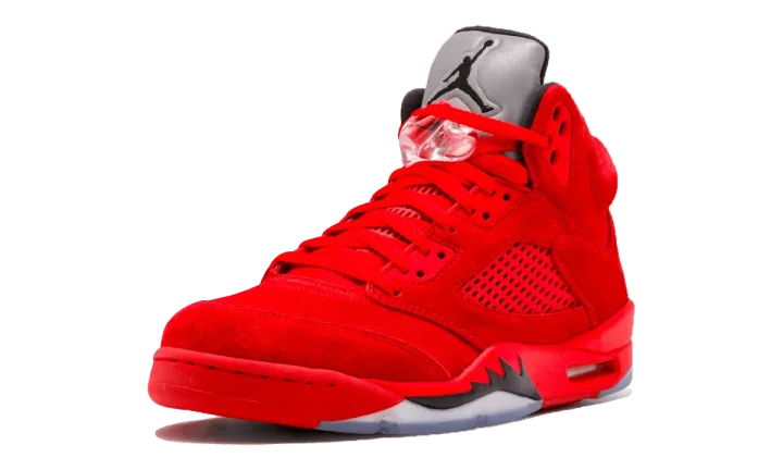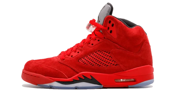 Not to be confused with the "Raging Bulls" colorway, Jordan Brand ushered in summer 2017 with this Jordan 5 in "Red Suede." As the name infers, the upper is dressed in a tonal red suede, including the coated mesh panels and lace tabs. The glaring difference between the "Raging Bulls" and this shoe is a matching red midsole, black shark teeth, and an icy outsole to match the reflective 3M tongue. The result is a slick sneaker that stays true to Michael Jordan's lineage as a perennial player for the Chicago Bulls. And that's without mentioning that these kicks are bound to turn heads.