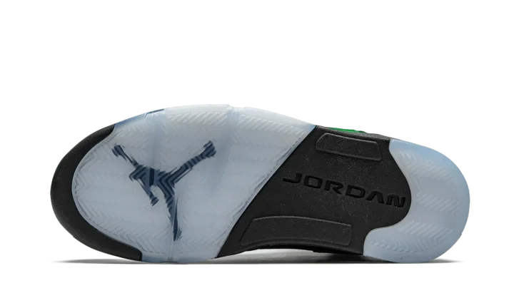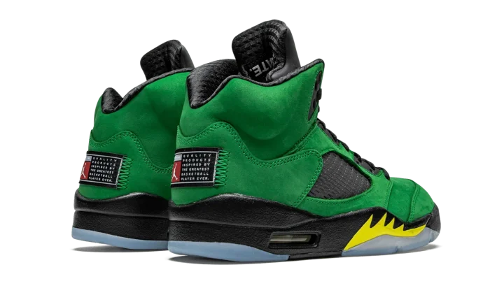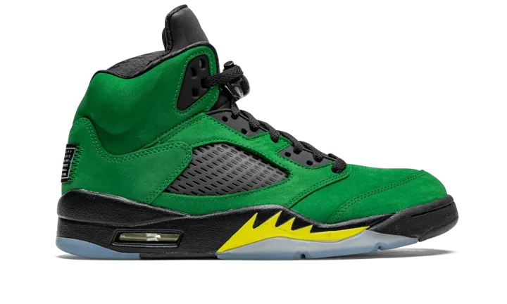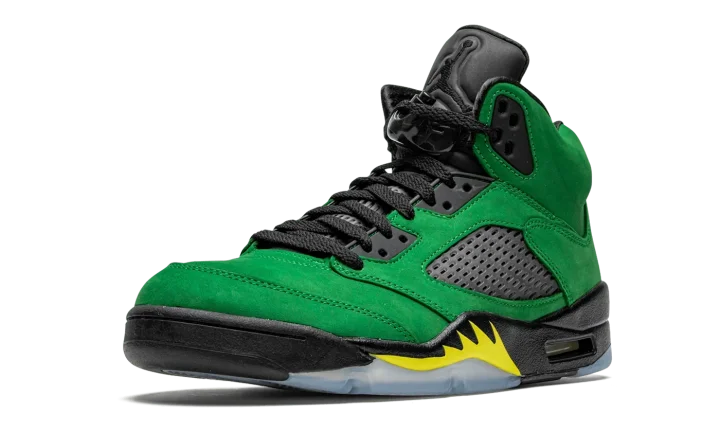 The Air Jordan 5 "Oregon" honors the Oregon Ducks as Jordan Brand celebrates the 30th anniversary of Michael Jordan's legendary fifth signature shoe in 2020. Devoid of any Ducks branding, the colorway nonetheless graciously employs the school's familiar green, yellow, and black color scheme. Save for the smoky translucent netting found on the mid-panel and tongue, the entire upper is cast in green suede for a bold and unique appearance. Additional styling includes black laces, a semi-translucent lace lock with Jumpman detailing, and embroidered "Team Jordan" patch on the heel. The black leather tongue displays a tonal embossed Jumpman logo and the black rubber midsole features yellow accented shark tooth detailing on top of an icy blue translucent outsole. Release date: September 12, 2020.