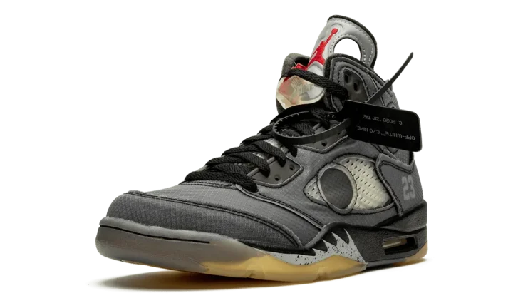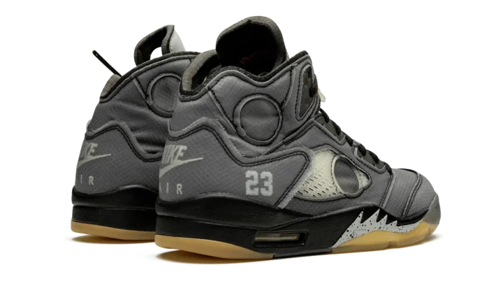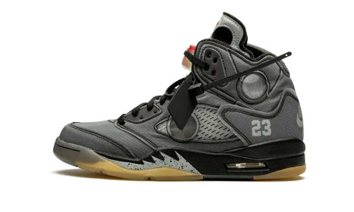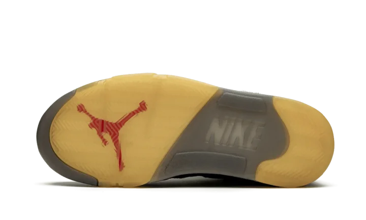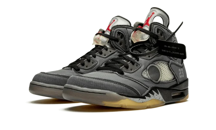 The Off-White x Air Jordan 5 is Virgil Abloh's rendition of Michael Jordan's fifth signature shoe that incorporates the former's deconstructed design ethos. The NBA All-Star Weekend 2020 release omits the Jordan 5's traditional leather construction for a light grey synthetic, semi-translucent material. Circular designs with Abloh's signature Nike branding motif can be found on the inside of each shoe over the midfoot netting. For the first time ever on a non-original Air Jordan 5 colorway, embroidered Nike Air branding appears on the heel. White "23" detailing covers the heel near the midsole and a fiery red Jumpman covers the 3M-reflective tongue. A pre-yellowed outsole gives the Off-White Jordan 5 the already-worn-in vibe that Abloh often prefers to include on his collaborations with both Nike and Jordan Brand. Release date: February 2020.