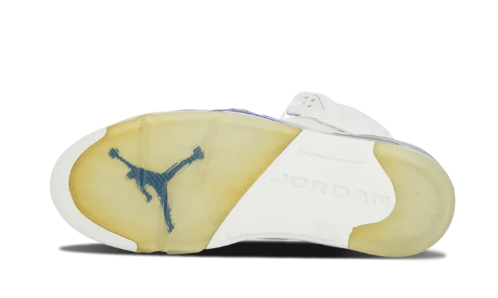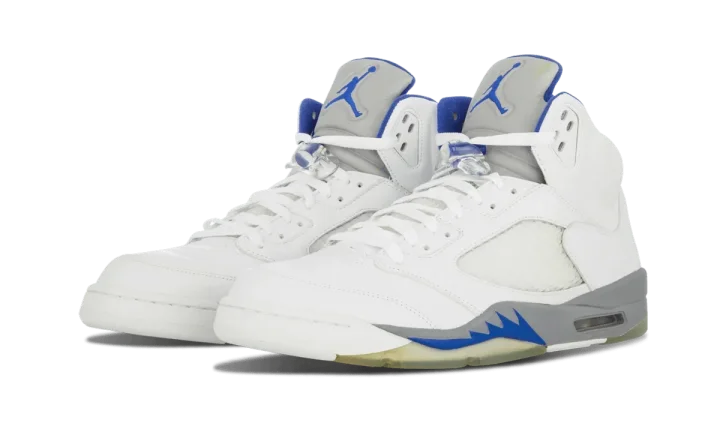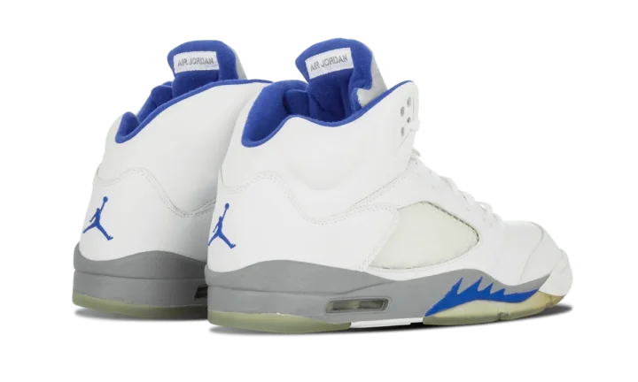 Now considered an all-time classic colorway of the Air Jordan 5, this retro edition from 2006 features a white leather upper with royal blue and grey accents.