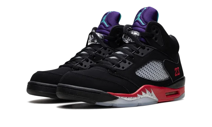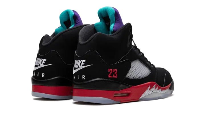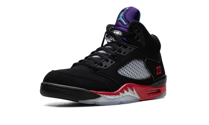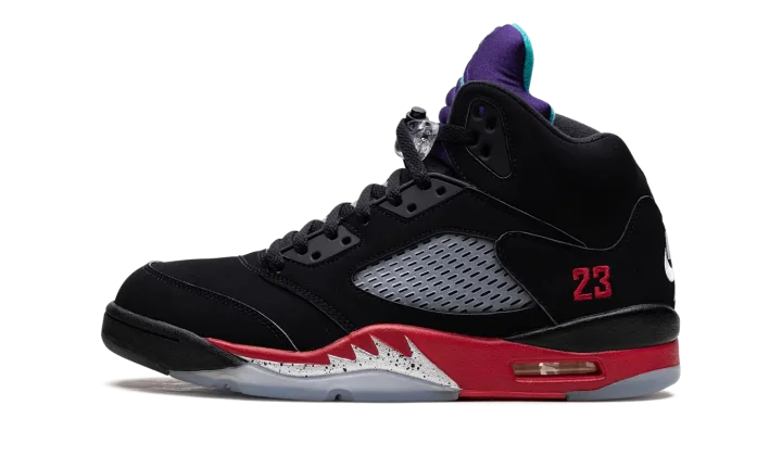 The Air Jordan 5 "Top 3" is an amalgamation of three of the most heralded colorways to have appeared on Michael Jordan's fifth signature shoe. The "Grape," "Fire Red," and "Black Metallic" all are incorporated into the design of this shoe. The upper sports a black nubuck composition taken directly from the "Black Metallic" look. Translucent netting is located on the mid-panel while the tongue is inspired by the groovy '90s-era "Grape" design. Embroidered red "23" branding on the quarter panel and embroidered white "Nike Air" detailing on the heel provide a healthy dose of nostalgia. The Air window in the heel is encased within a fiery red midsole that features cement shark tooth detailing. Jordan Brand finishes off the look with an icy translucent outsole. Release date: May 30, 2020.