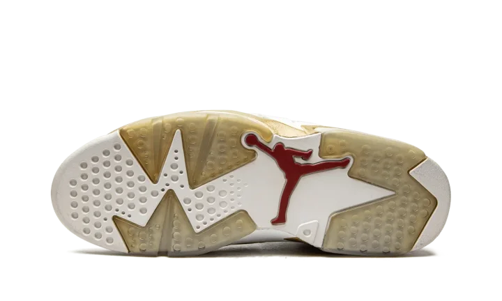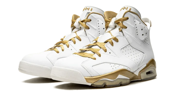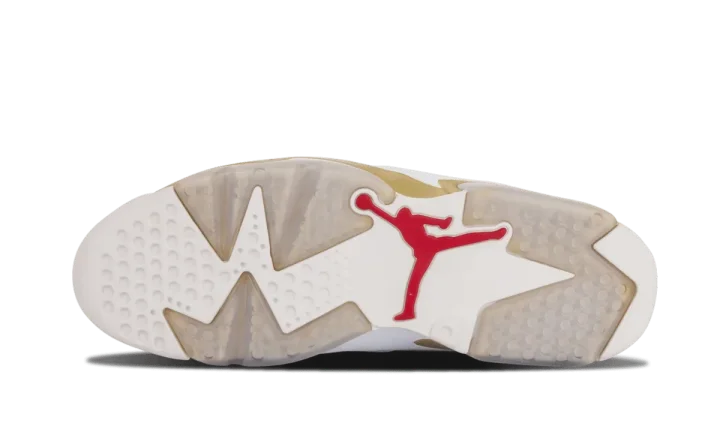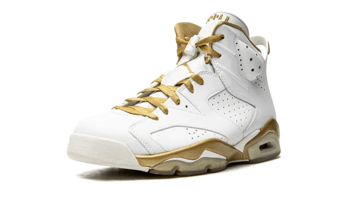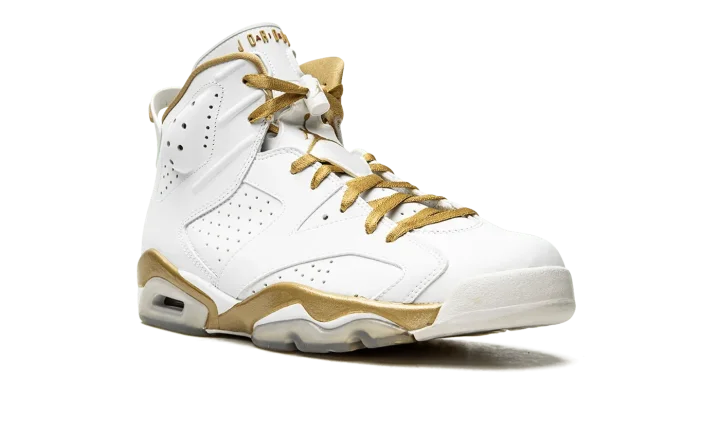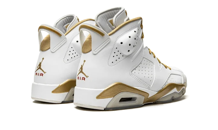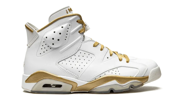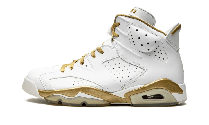 Part of a two-shoe collection with the Air Jordan 7, the "Golden Moments" pack features each shoe in gold trim in honor of the USA basketball team taking home the gold medal back in 1992, when Michael Jordan wore the Air Jordan 7, and 2000, when Ray Allen and Vin Baker wore the "Olympic" Air Jordan 6. The 6 features a white leather upper with plenty of gold trim and an American flag graphic on the insole to drive home the patriotic theme.