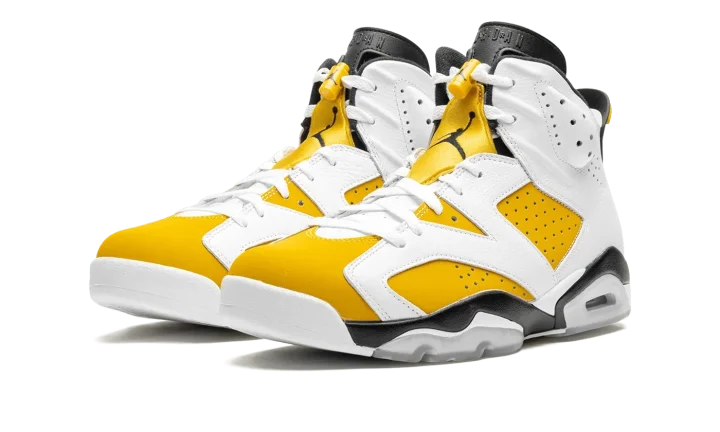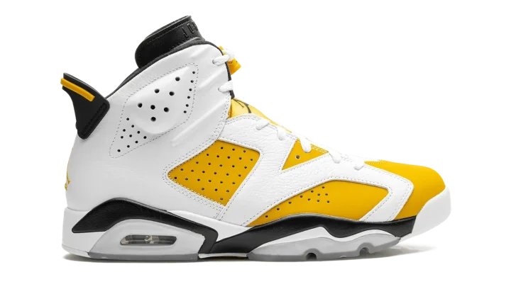 The Air Jordan 6 "Yellow Ochre" is a colorway of Michael Jordan's sixth signature shoe with a white-and-yellow color scheme. Featuring the reconizable color block of the original "Carmine" Air Jordan 6, this "Yellow Ochre" colorway replaces all of the red accents with an earth tone shade of yellow. The yellow hue in question is found on the synthetic nubuck base of the shoe, along with white leather overlays and black detailing throughout. The Jordan 6's signature icy translucent rubber outsole and visible Air unit in the heel complete the design. Release date: January 27, 2024