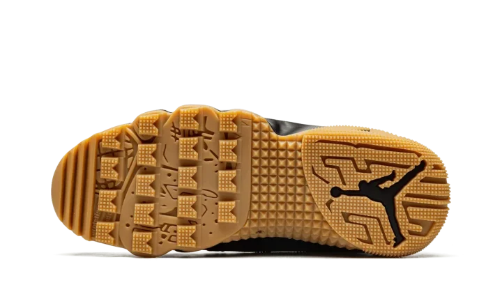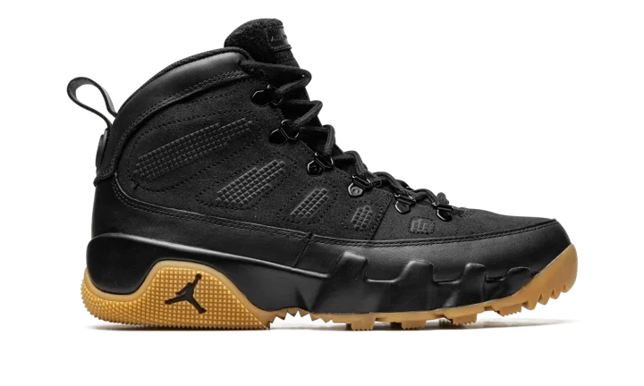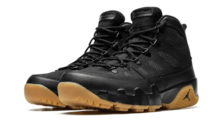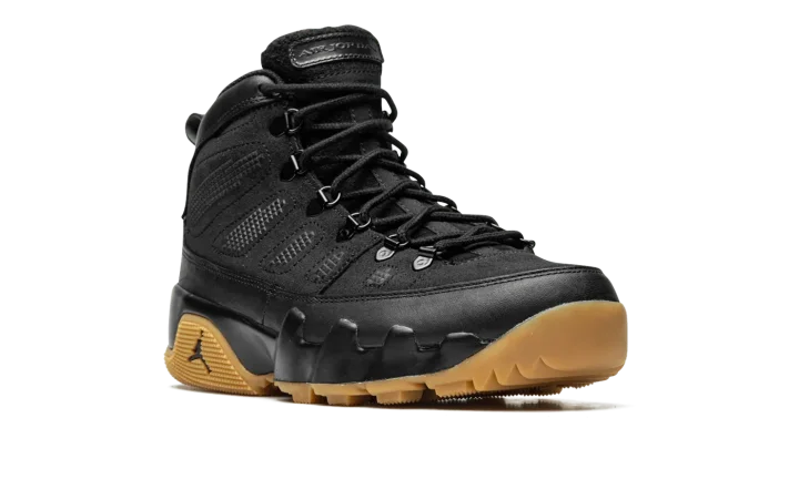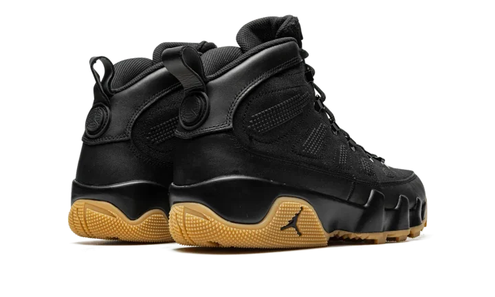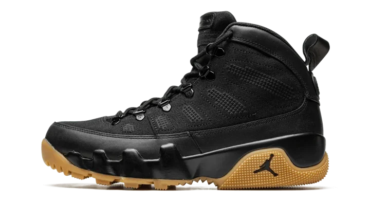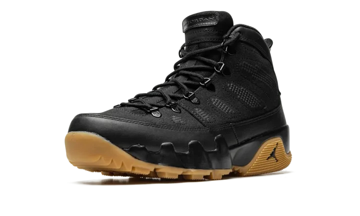 The Air Jordan 9 Boot "Black/Gum" is a November 2021 release of Michael Jordan's ninth signature basketball shoe recrafted as a winter boot. Originally released by Jordan Brand in 2017, the Jordan 9 Boot in "Black/Gum" returned as part of Jordan's Holiday 2021 release cycle, and is a one-to-one remake of the original style. Inspired by Nike's Special Field Boot, the Jordan 9 Boot has a black suede base with tonal leather detailing on the mudguard that spans the toe up to the collar. Both details have been treated with a water-resistant coating. Boot-inspired metal eyelets and a gusseted tongue provide a rugged look. A tonal "globe" emblem is found on the heel. The rugged sole with upgraded tread for inclimate weather is constructed in gum rubber. Release date: November 24, 2021