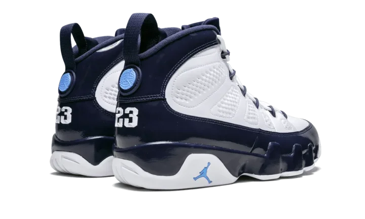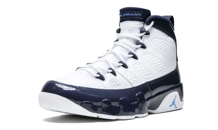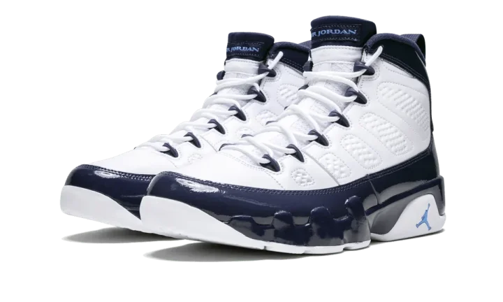 The Air Jordan 9 "UNC" is a 2019 retro of the classic ninth Michael Jordan signature shoe in a color scheme paying tribute to his college career at the University of North Carolina. The white leather, Midnight Navy upper with University Blue accents is actually reminiscent of the classic Air Jordan 9 Low "Pearl Blue" colorway from 2002. The vintage color scheme translates perfectly to the Air Jordan 9 Mid for this new "UNC" colorway, which fittingly released just before the 2019 NBA All-Star Weekend in Charlotte, North Carolina.