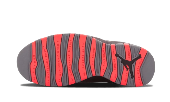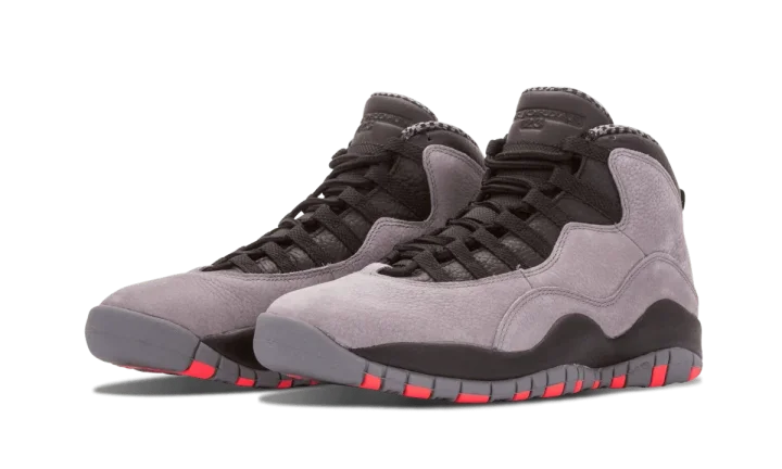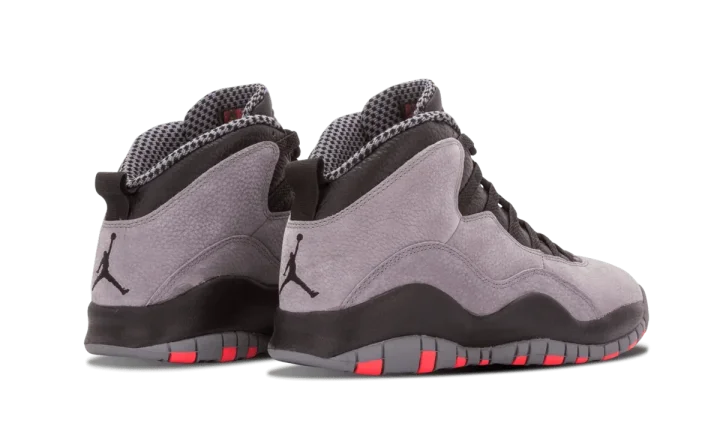 This release of the Air Jordan 10 from 2014 features the shoe in one of its most appealing new colorways ever. The soft nubuck upper is presented in shades of grey, while black leather adds detailing and hits of red highlight the iconic outsole design. The final product is somewhere in between the original "Shadow" and "Chicago" colorways for a clean and easily wearable look.