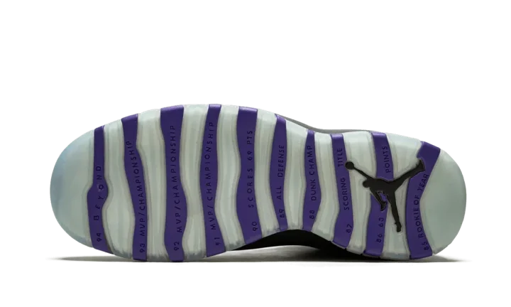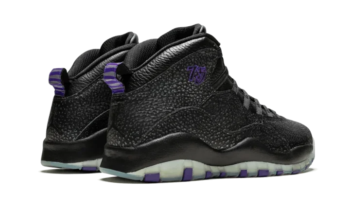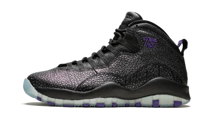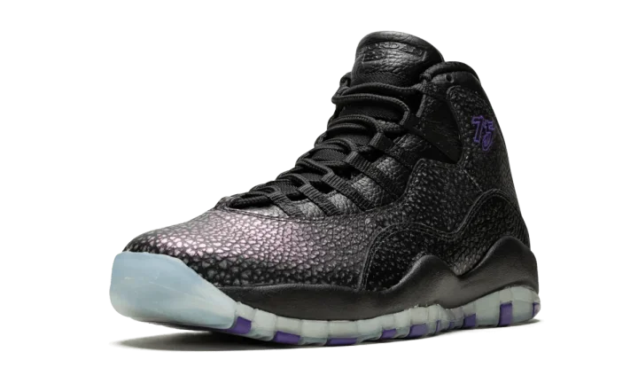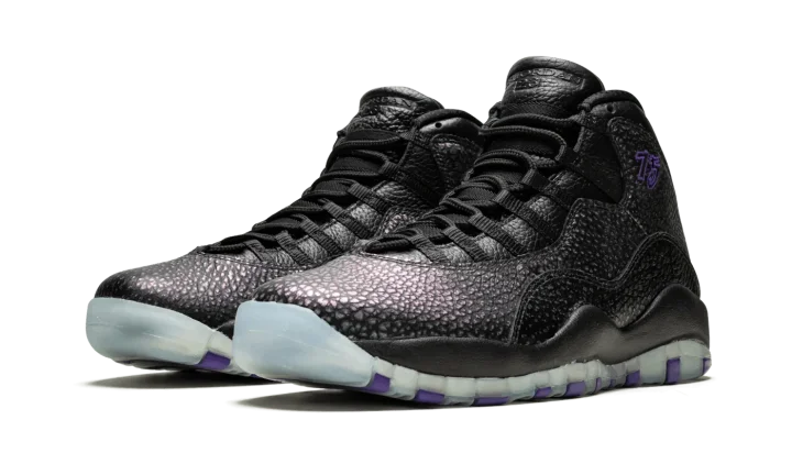 Released in the Air Jordan 10 "City Pack" from 2016, this colorway represents Paris. Inspired by the City of Lights, the shoe features an elephant textured black leather burnished with silver while purple accents and an icy clear outsole complete the unique look. Featuring an ankle length, a lace-up front fastening, a round toe, a textured leather detail and a flat rubber sole. These styles are supplied by a premium sneaker and street wear marketplace. Stocking only the most sought-after footwear and clothing, they source and curate some of the most hard-to-find items from around the world.