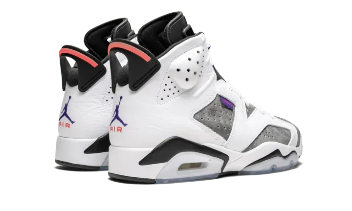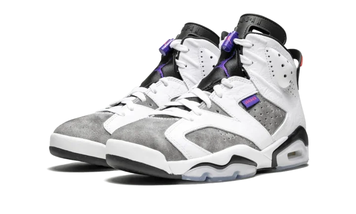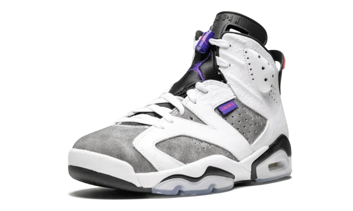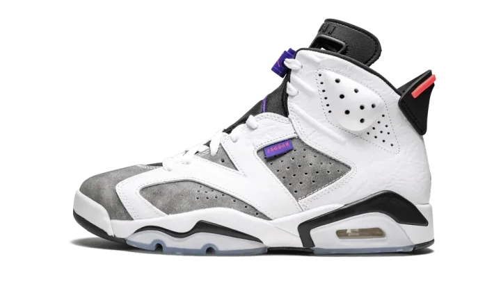 The Air Jordan 6 "Flint Grey" is a special edition of the classic Michael Jordan signature shoe that released in 2019. Featuring a color block similar to the original "Carmine" colorway of the Jordan 6 with new hues and materials, this "Flint Grey" edition features a grey suede base with white full-grain leather overlays and dark blue accents for the tongue, heel tab, and midsole. Bright hits of Infrared and Dark Concord add a pop of color to the color palette, including for the added Air Jordan logo tab on the midfoot. The Air Jordan 6 "Flint Grey" released in January 2019.