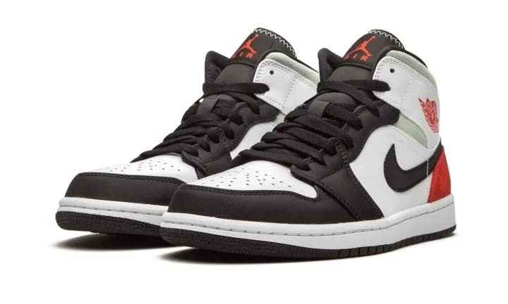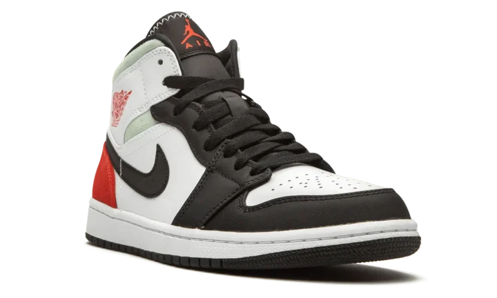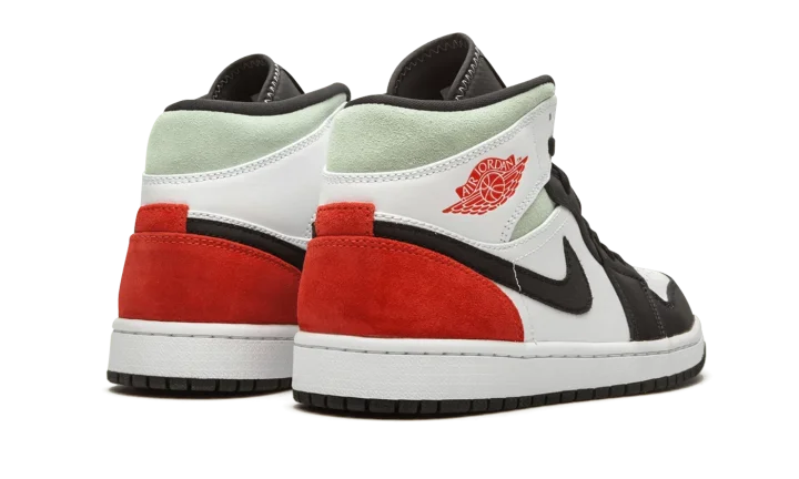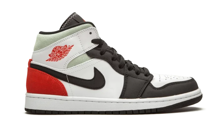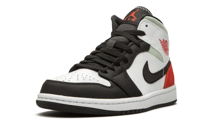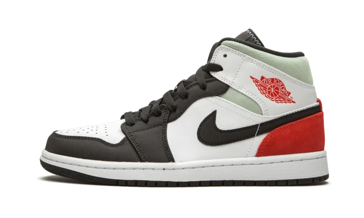 The Air Jordan 1 Mid "Red/Grey/Black Toe" rearranges the color scheme of the original "Black Toe" colorway of Michael Jordan's first signature shoe in mid-top form. Slimmed down to mid-top height, this Jordan 1 features a familiar color scheme employed by some of the most coveted shoes in Jordan Brand history. A medley of materials appear on various panels across the upper. White leather forms the base and can be found on the perforated toe, mid-panel, and collar overlay. Against the white base, the black nylon overlays on the forefoot, toe cap, and eyelets are reminiscent of the color block of the original "Black Toe" Jordan 1. Branding details include a black nylon Swoosh on either side, a red "Wings" emblem on the collar, and a red accented Jumpman logo on the black nylon tongue tab. Fiery red suede is located on the heel with grey suede appearing on the collar.