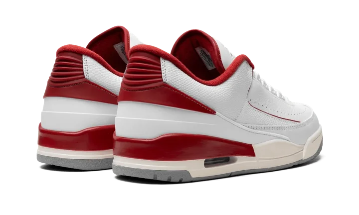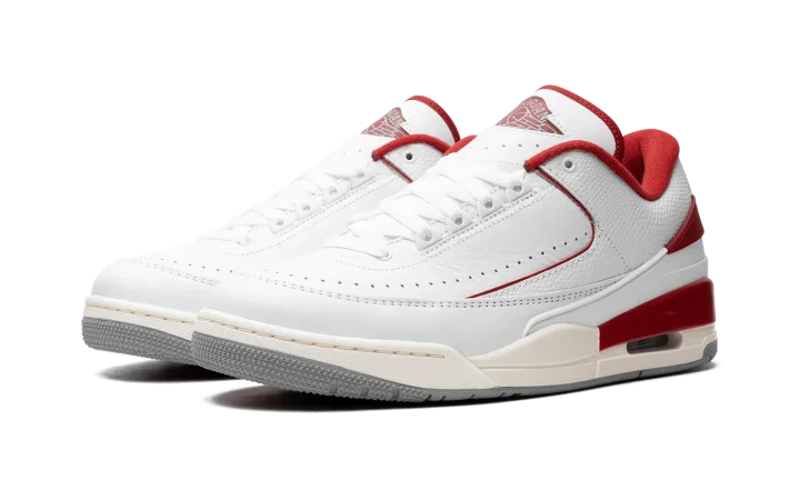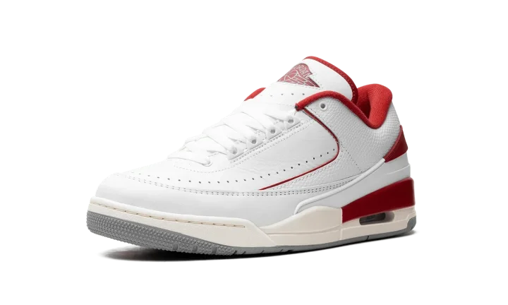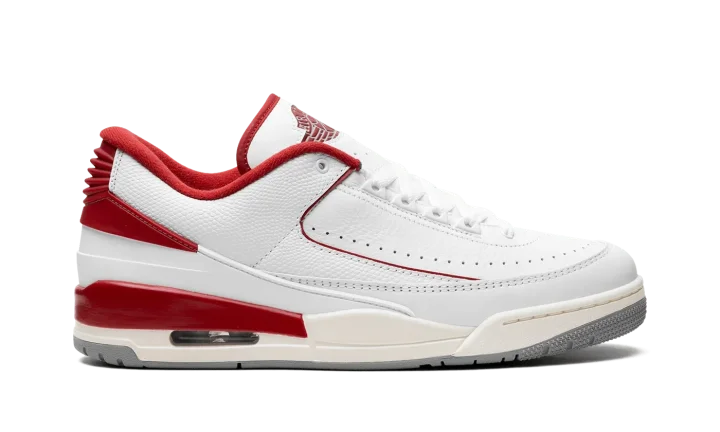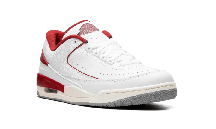 The Jordan 2/3 GS "Varsity Red" is the youth sizing of the Chicago Bulls-inspired colorway of the hybrid sneaker that combines elements of the Air Jordan 2 and Air Jordan 3. The Jordan 2/3 fuses details from the Jordan 2 and Jordan 3, including the sole unit from the Jordan 3 and and the upper construction of the Jordan 2 Low, among other features. On this colorway, the shoe has a white leather construction with contrasting Varsity Red accents on the "Wings" logo on the tongue, on the inner lining, on the heel counter, and mudguard. Perforations around the toe provide ventilation. The Jordan 3-inspired midsole has a slightly aged look and features an Air unit in the heel.