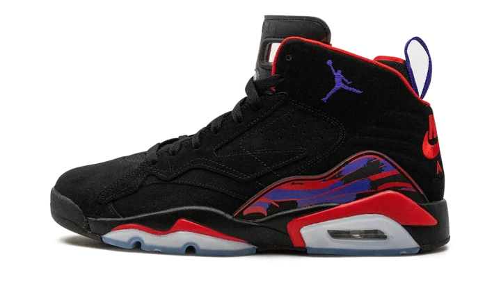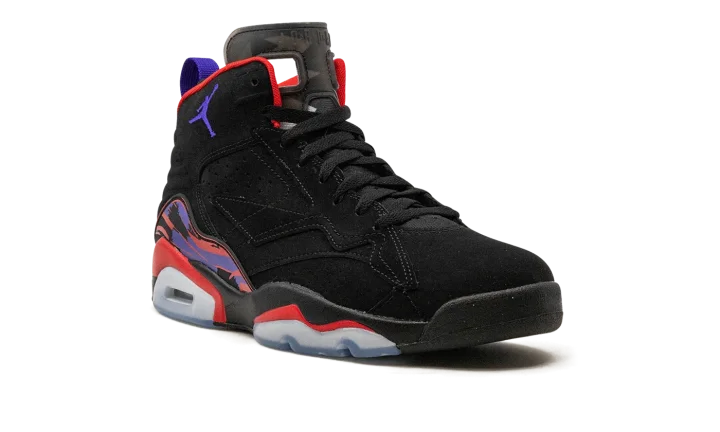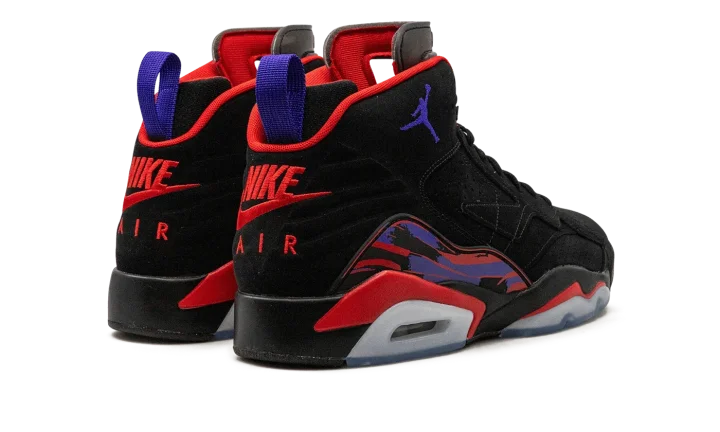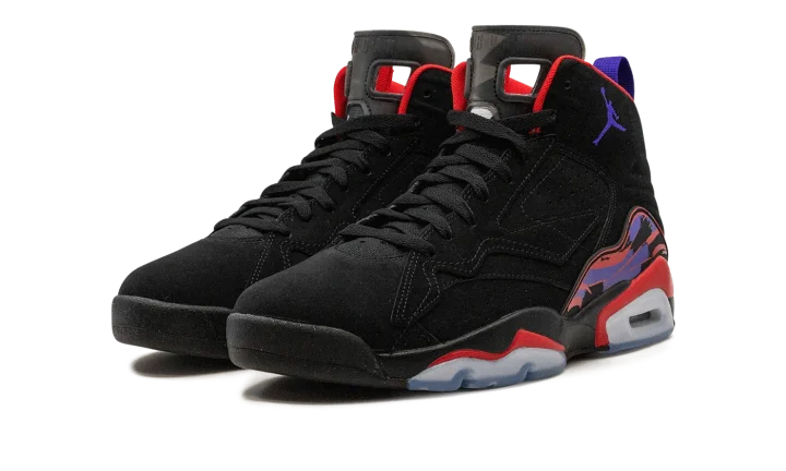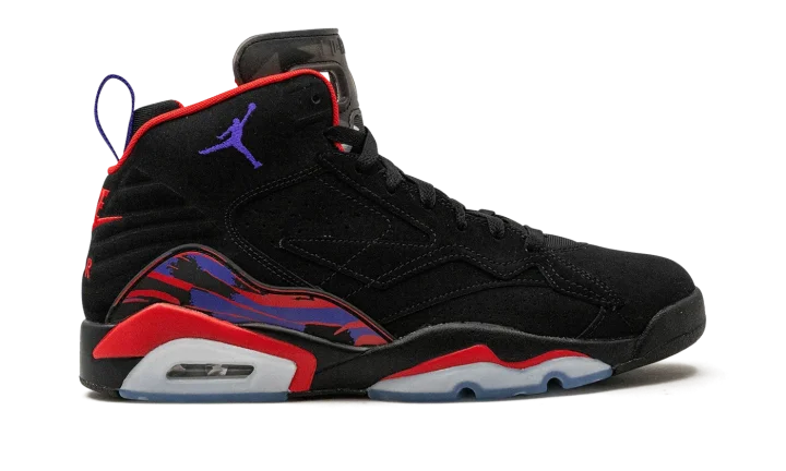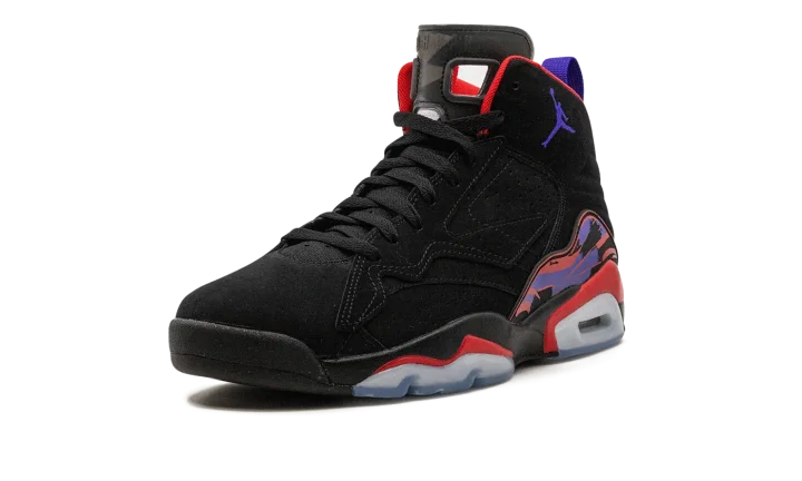 The Jordan MVP 678 "Raptors" is a colorway of the hybrid shoe that combines elements of the Air Jordan 6, Air Jordan 7, and Air Jordan 8 that is inspired by the Jordan 7 "Raptors" from 1992. The "Raptors" Jordan MVP 678 features a black synthetic nubuck construction with perforations on the sides. A purple Jumpman is embroidered on the collar and purple and red detailing is seen on the mudguard, a design element taken from the Jordan 8. Other details include "Nike Air" branding on the heel and the Jordan 6's tongue in smoky clear rubber with a graphic inspired by the Jordan 7's tongue visible beneath. The shoe's midsole is based on the Jordan 6. Release date: June 20, 2023