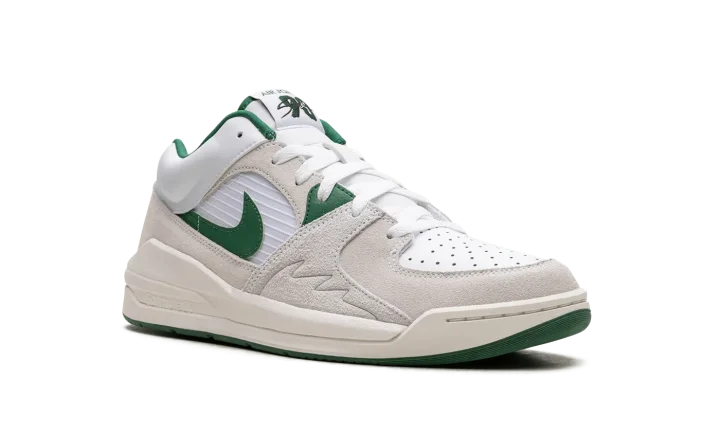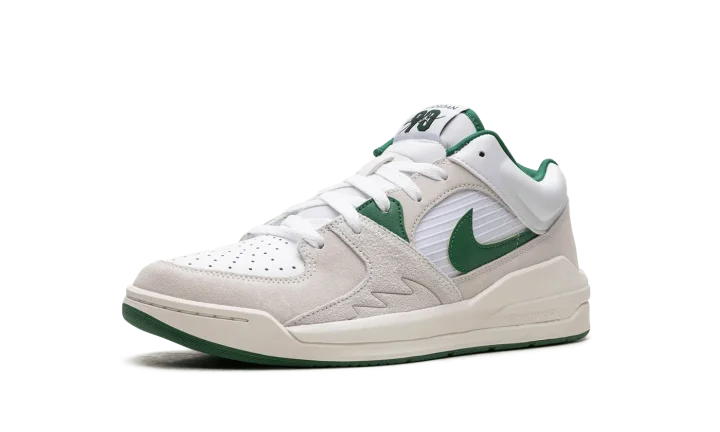 The Jordan Stadium 90 "White/Clover Green" is a clean and timeless colorway of the lifestyle sneaker that combines various design elements of the Air Jordan 5 along with hints of the Air Jordan 1. The shoe is complete with a white netted mid-panel, a white leather perforated toe, and cream hairy suede overlays. A Clover suede Swoosh is found on either side. Retro-inspired "Jordan" branding appears on the tongue. A subtle "shark tooth" detail is debossed on the lateral sides near where the motif is also found on the Jordan 5. Formula 23 cushioning technology in the heel of the cream foam midsole provides a comfortable ride.