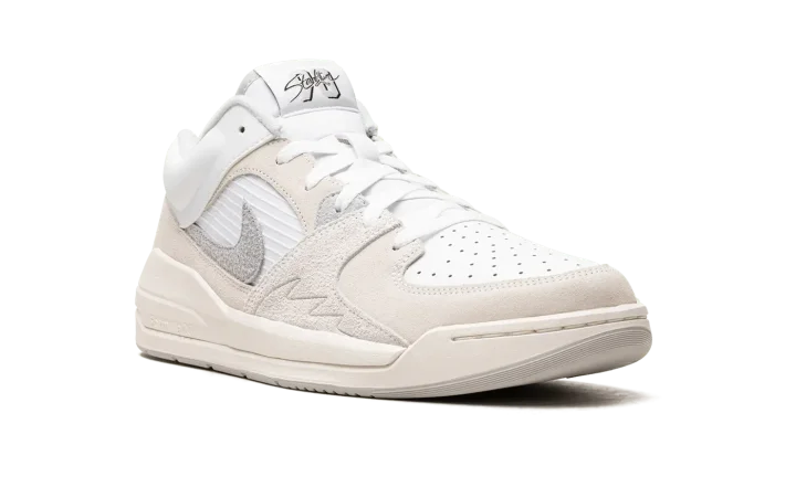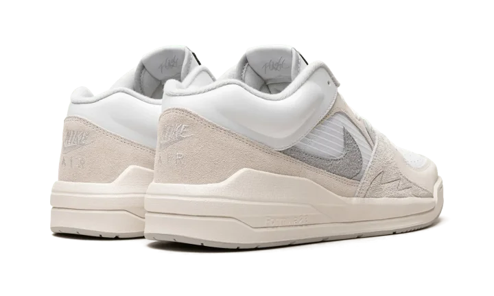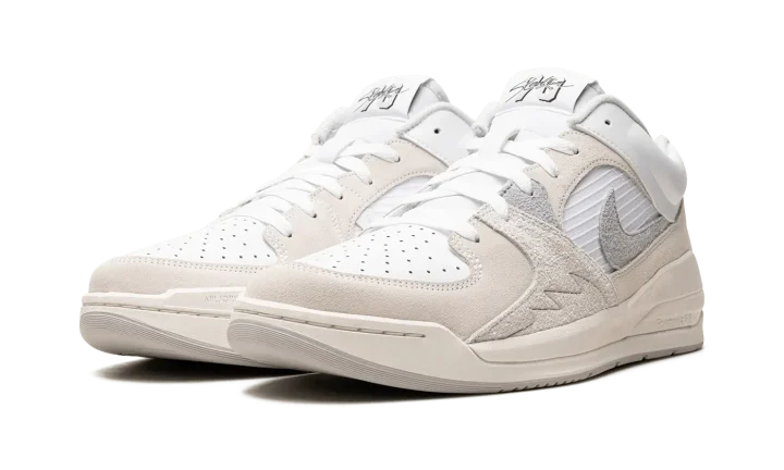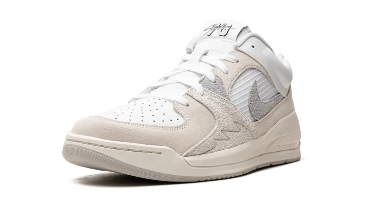 The Jordan Stadium 90 "White/Grey" is a versatile colorway of the hybrid sneaker that combines various design elements of several iconic Air Jordan models. Like the Jordan Dub Zero and Jordan 6 Rings, two shoes with the design cues of multiple old school Air Jordans, the Jordan Stadium is a 1990s-inspired shoe that salutes Jordans from throughout the '90s. The shoe is complete with a white netted mid-panel, a white leather perforated toe, and light grey hairy suede overlays. A grey Swoosh is found on either side. Retro Jordan branding appears on the tongue. Underfoot, Formula 23 cushioning technology in the heel of the cream foam midsole provides a comfortable ride. Release date: March 25, 2023