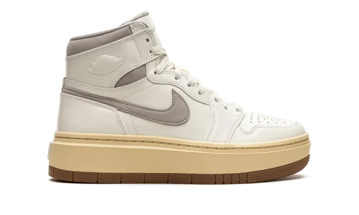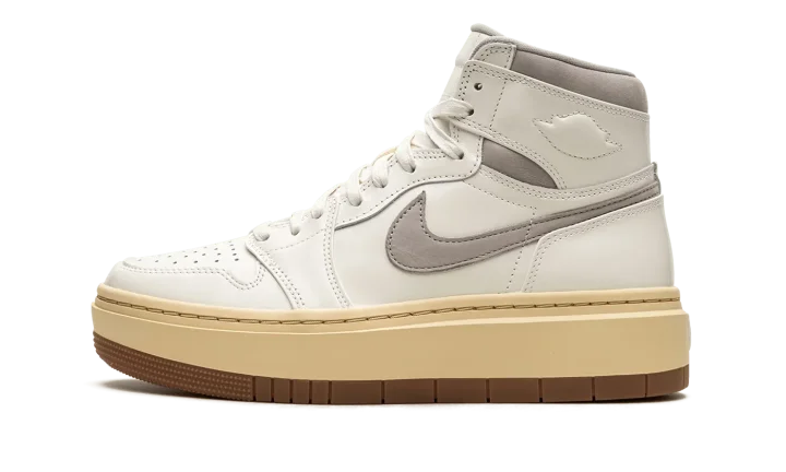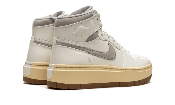 The Women's Air Jordan 1 Elevate High "Sail/Grey" is a women's-exclusive version of the lifestyle shoe with a modified design that features a platform-style sole. The Jordan 1 Elevate High features an oversized rubber sole that adds height to the silhouette. In spite of the modified look, the rest of the shoe still remains somewhat consistent with the Jordan 1 High OG model. The colorway features a Sail leather base with Neutral Grey leather overlays and Swoosh branding. A bubble-style "Wings" logo appears on the heel. An aged rubber midsole and brown segmented rubber outsole complete the look. Release date: June 20, 2023