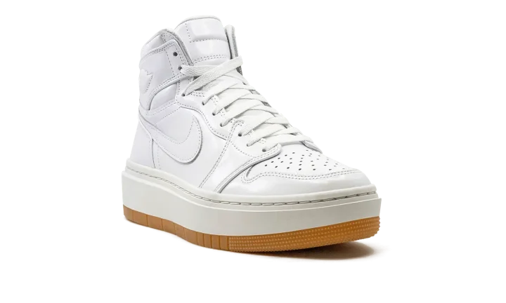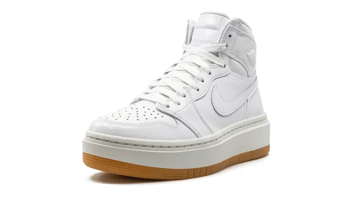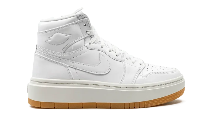 The Women's Air Jordan 1 Elevate High "White/Gum" is a women's-exclusive colorway of the lifestyle sneaker with a platform-style sole. The Jordan 1 Elevate High modifies the Jordan 1 High with a contemporary twThe rest of the shoe still remains somewhat consistent with the Jordan 1 High OG model. The upper features a monochromatic white leather appearance with a bubble-style "Wings" logo on the heel.
