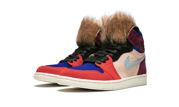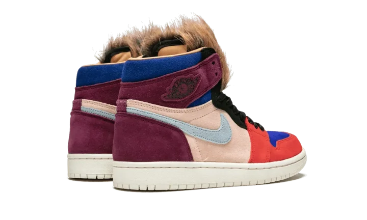 For her second Air Jordan 1 collaboration, stylist Aleali May took Michael Jordan's first signature shoe in a bold, fashion-forward direction. While May's first Jordan 1 in 2017 offered a riff on the popular "Shadow" colorway, her 2018 women's Air Jordan 1 is a completely original look. May teamed up with WNBA superstar Maya Moore on the Court Lux Air Jordan 1 that mixes a dusty pink, blue, purple, and red on the upper and contrasts the colors with a stark black. The most notable design feature of the Aleali May x Air Jordan 1 is the removable faux fur tongue patch that is unlike anything seen on the silhouette before. The release date for the limited edition Maya Moore x Aleali May Court Lux Air Jordan 1 was December 22, 2018.