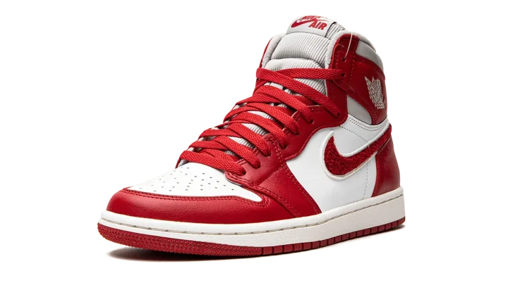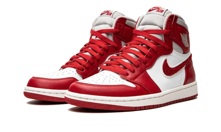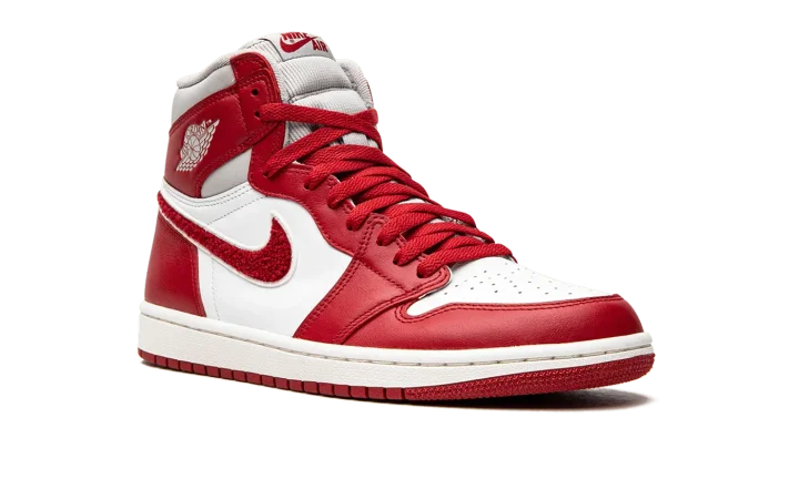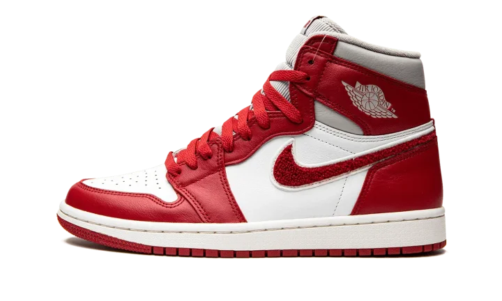 The Women's Air Jordan 1 High OG "Newstalgia" is a women's-exclusive colorway of Michael Jordan's first signature shoe with a premium build. Inspiration for the "Newstalgia" is sourced from vintage varsity letterman jackets, specifically the chenille patches that are often found on their design. The shoe's perforated toe and mid-panel are designed in white leather. Contrasting Varsity Red leather appears on the overlay panels. As mentioned, the shoe pulls inspiration from old school letterman jackets, as its Swoosh is designed in a fiery red chenille material. A light grey "Wings" logo appears on the collar. Additional design elements include a grey corduroy collar, red "Nike Air" branding on the tongue tag, and red laces. Release date: July 20, 2022