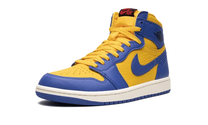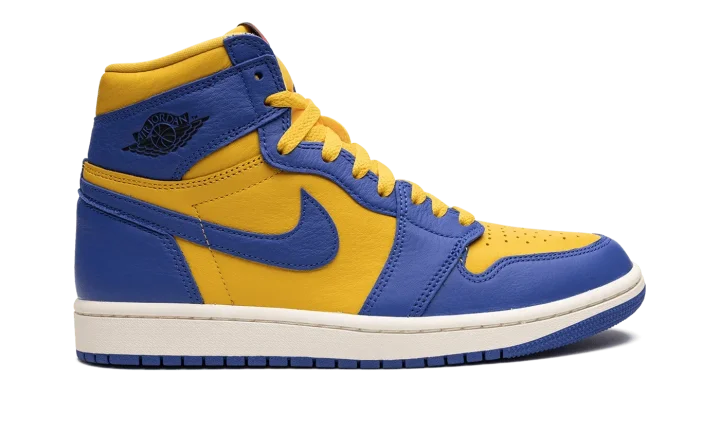 The Women's Air Jordan 1 High OG "Reverse Laney" is a women's-exclusive colorway of Michael Jordan's first signature shoe that flips the color block of a popular, non-original Air Jordan 1 colorway. The shoe in question is the Jordan 1's "Laney" design, a release from 2013 that references the team uniform colors of Jordan's high school basketball team. The shoe features a Varsity Maize leather base with contrasting Game Royal leather overlays and Swoosh branding. A classic "Wings" logo appears on the collar and red "Nike Air" detailing is found on the tongue. The shoe's white rubber midsole and blue outsole complete its design. Release date: February 17, 2023