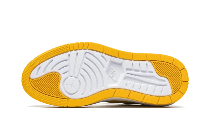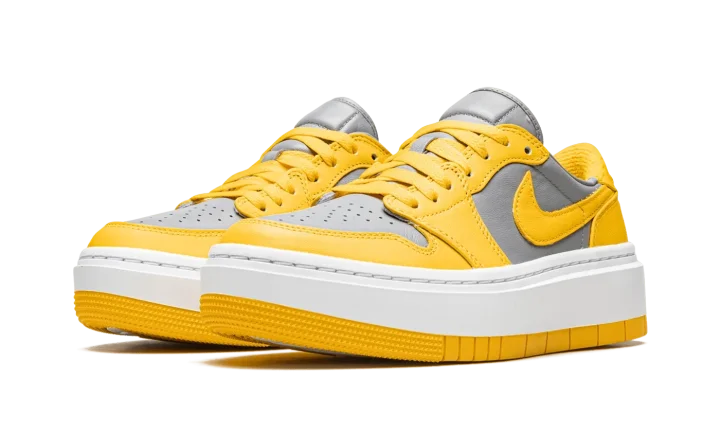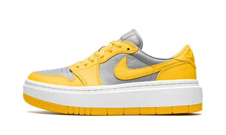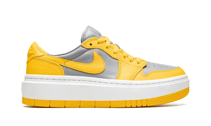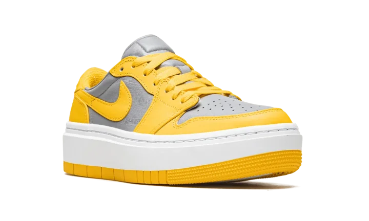 The Women's Air Jordan 1 Low Elevate "Varsity Maize" is a women's-exclusive colorway of the casual shoe with a platform-style sole. The Jordan 1 Low Elevate is equipped with an oversized white rubber sole that adds significant height to the wearer, and is yet another example of Jordan Brand progressing the Jordan 1's design into the future. Cement Grey-colored leather is found on the perforated toe and mid-panel. Varsity Maize leather overlays and Swoosh branding contrast the neutral-colored base. A bubble-style "Wings" logo appears on the heel.