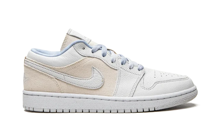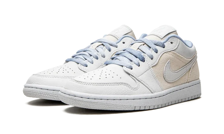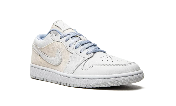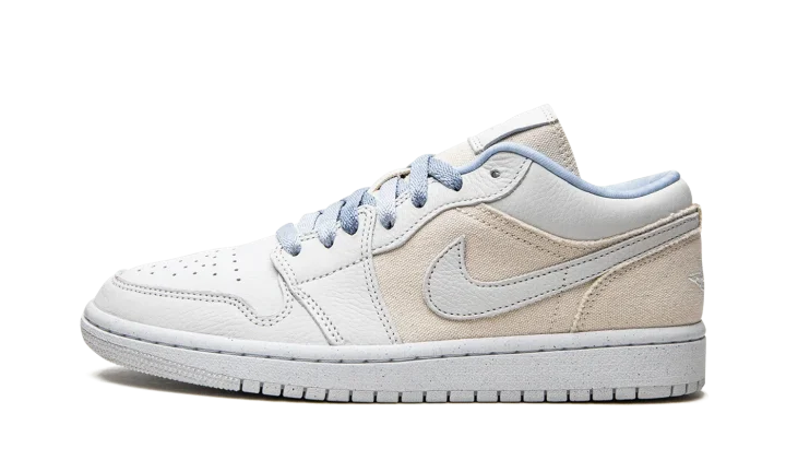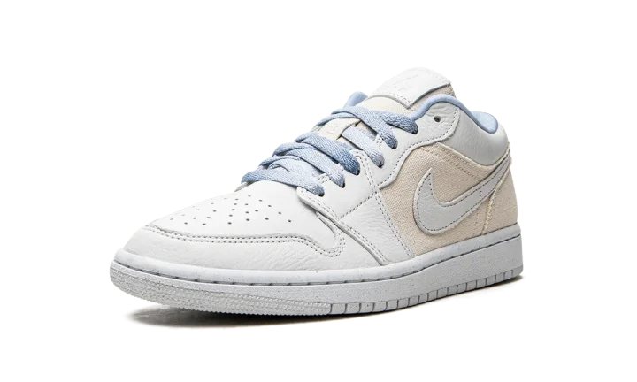 The Women's Air Jordan 1 Low SE "Canvas" is a women's-exclusive, summer-inspired colorway of Michael Jordan's first signature shoe in low-top form. A release from Jordan Brand's Summer 2022 collection, the "Canvas" features a combination of materials and neutral colors on its design. Specifically, the perforated toe, forefoot, eyelets, and collar are constructed in white leather. The mid-panel, heel, and tongue are arranged in a natural canvas textile. A full-grain white leather Swoosh is located on the sides, and a white "Wings" logo is embroidered on the heel. Tonal Jumpman and "Air" detailing appear on the white leather tongue tag. The light blue laces and inner lining add another element to the shoe's summer-ready appearance.