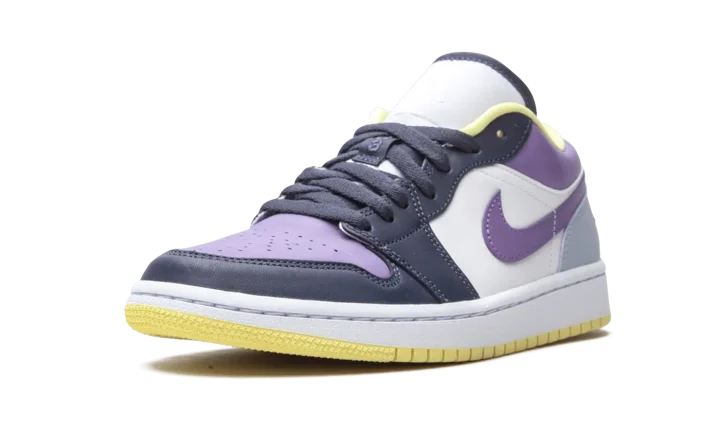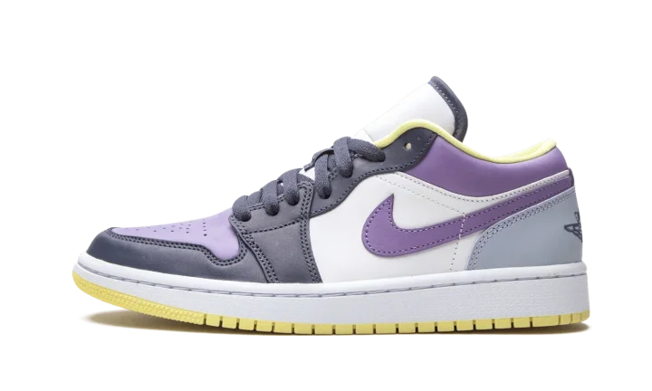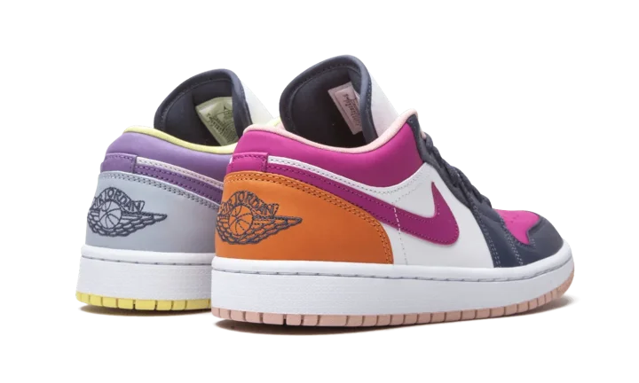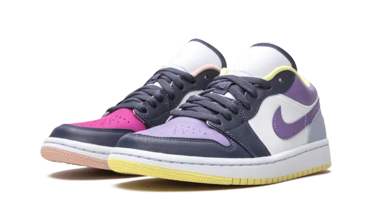 The Women's Air Jordan 1 Low "Mismatched Purple/Magenta" is a women's edition of Michael Jordan's first signature shoe dressed in a colorway inspired by the colorful vibrations of spring. This low-top model features an attention-drawing mismatched design that includes various shades of purple, magenta, blue, and orange across both the left and right shoe. While both pairs feature contrasting leather panels and Swoosh branding on the mid-panel, they share a white embroidered Swoosh on the nylon tongue and blue "Wings'' branding on the heel. "23" insignia is stitched onto the lace overlay of both the left and right shoe.